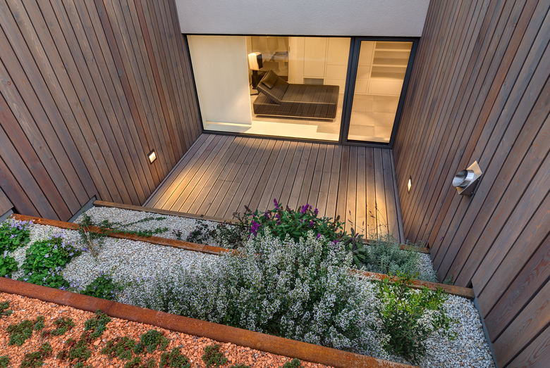 In Norden wird der Garten durch ein Hochbeet gefasst. Ein, in das Gelände geschnittener, Tiefhof stellt einen Außenraumbezug zum Wellness-/Sauna-Bereich im Keller her. Zudem bietet der Tiefhof einen sichtgeschützten Außenbereich.