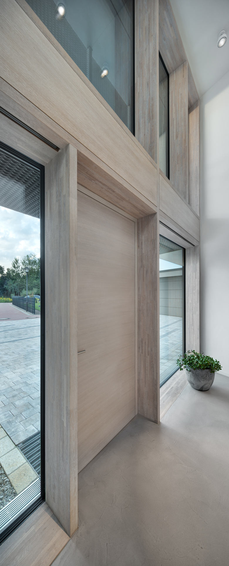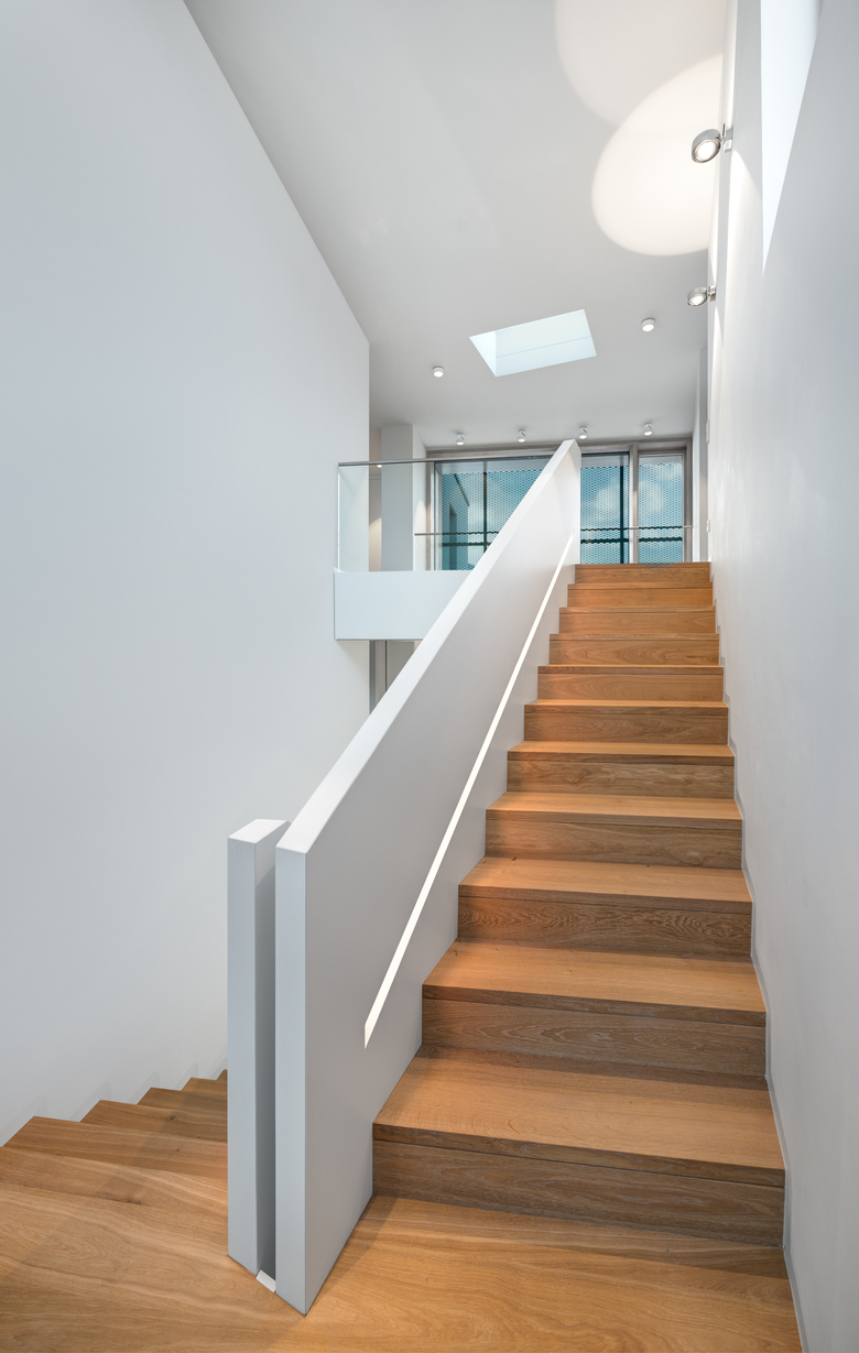 Dem Eingang schließt sich das zweigeschossig durchgesteckte Treppenhaus an. Als gebäudehoher Luftraum konzipiert wird eine Treppe mit einer querenden Brücke im Obergeschoss eingestellt.