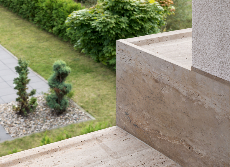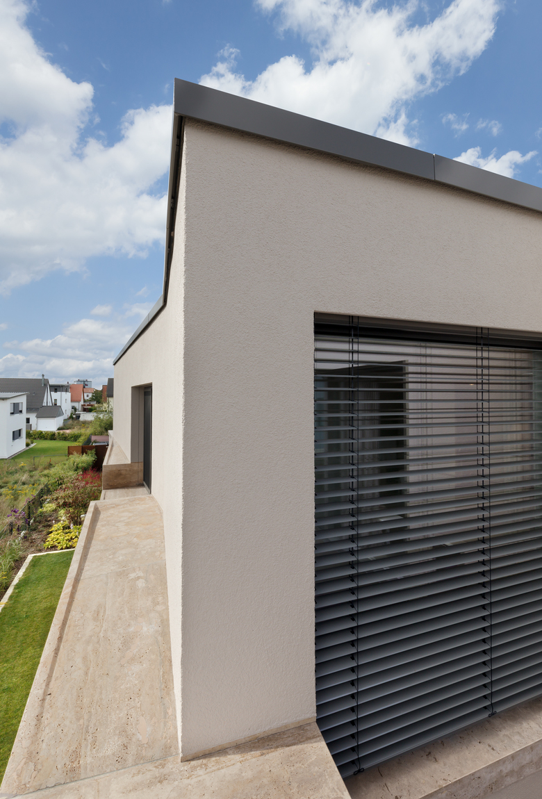 Die Außenfassaden sind verputzt. Die Holz-Alu-Fenster mit großzügigen Glasflächen besitzen außenliegenden Raffstoreelemente. Die Fensterbänke sind aus Travertin gefertigt.