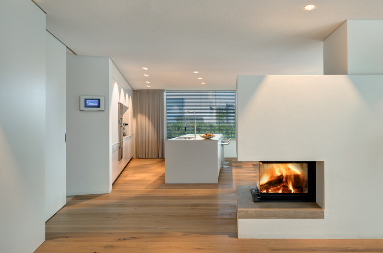 Im Erdgeschoß gliedern sich im Süden der Wohnraum und Küche mit Essbereich an. Die beiden Bereiche werden durch das raumbildene Kaminvolumen getrennt.