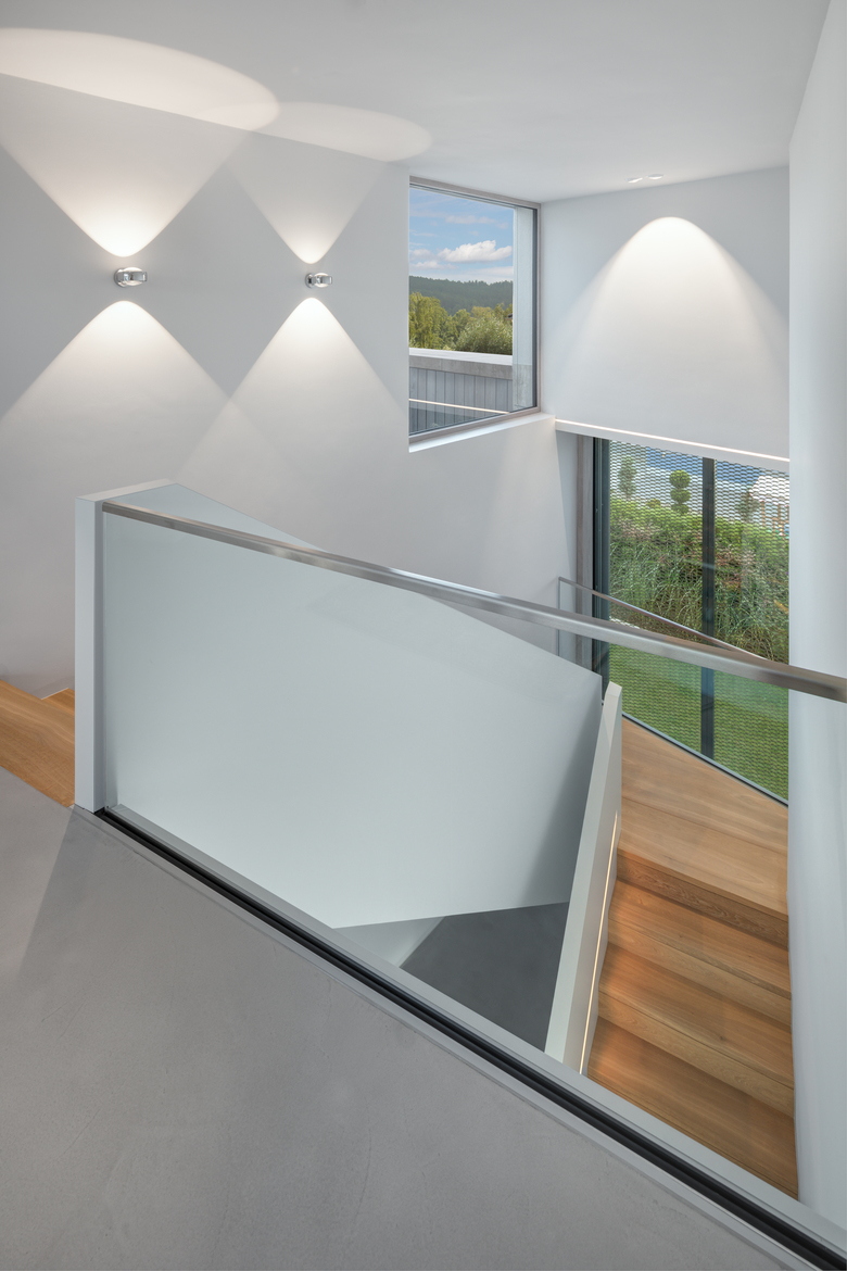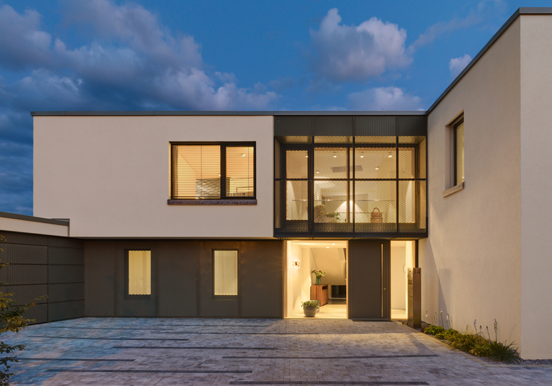 Generell wird das Wohnhaus durch zwei kombinierte Volumen gebildet. Der Eingang befindet sich in der Schnittstelle der beiden Gebäudeteile und tritt als portalartiger Einschnitt ins Gebäude in Erscheinung. Die großflächigen Verglasungen sind mittels eines Metallgewebes „ausgeblendet“. Bei Tag und Nacht verringert das Streckmetall die Einblicke, bei Nacht entsteht ein leuchtender Eindruck der Fenster.