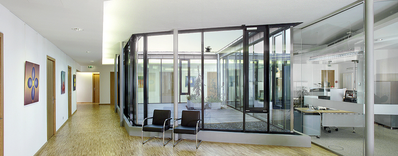 Die Belichtung des Komplexes erfolgt über die beiden Außenseiten und den zentralen Patio. Zur Optimierung der Transparenz und des Lichteinfalles im Kern des Gebäudes wird die massive Tragstruktur der Außenwände im Innenbereich aufgegeben und mit filigranen Stahlstützen ausgeführt. Der Patio bietet Freiraum für Pausen und sichert die natürliche Belichtung und Belüftung des Back-Office-Bereiches. Die Orientierung im Gebäude fällt leicht. Es entstehen interessante Einblicke, Ausblicke und Durchblicke. Entlang der beiden Außenwände sind Einzelbüros insbesondere für die Kundenbetreuung aufgereiht. Sondernutzungen wie Zugang, Abteilungsleiter, Besprechungs- und Sozialraum sind in den Ecken situiert, teilweise mit übersteigerten Raumhöhen.