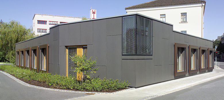 Das kubische Erscheinungsbild und die Materialität der Fassade unterstreicht den Entwurfsgedanken von „Schale und Kern“. In Konsequenz wurden für die Schale Decken und Außenwände als massive Stahlbetonkonstruktionen ausgeführt, während im Kern die Konstruktion aus Stahlstützen und Leichtbauwänden besteht. Damit wird die geforderte Flexibilität des Grundrisses gewährleistet. Nach außen ist die Fassade als vorgehängte hinterlüftete Fassade ausgeführt, mit einer Bekleidung aus großformatigen Faserzementtafeln. Die Tafeln bestehen aus durchgefärbten Faserzement, mit präzise gesetzten Fugenschnitt. Die Lärchenholzfenster sind mit markanten „Kupferrahmen“ gefasst, welche gleichzeitig die Sonnenschutzjalousien aufnehmen. Die Blenden der Holzfenster ermöglichen bei späterer Umnutzung den freien Anschluss flexibler Trennwände.