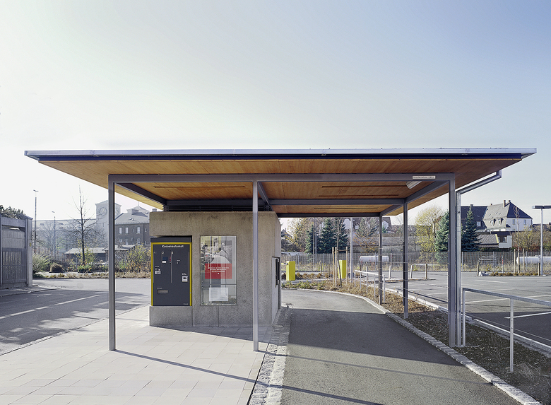 Das neue Service-Center der Stadtsparkasse steht am Rand der Altstadt in Weiden in der Oberpfalz. Der kubische, eingeschossige Flachbau ergänzt einen mehrgeschossigen Solitärbaukörper und vermittelt zum angrenzenden Parkplatz und dem „cash by car“-Pavillon.