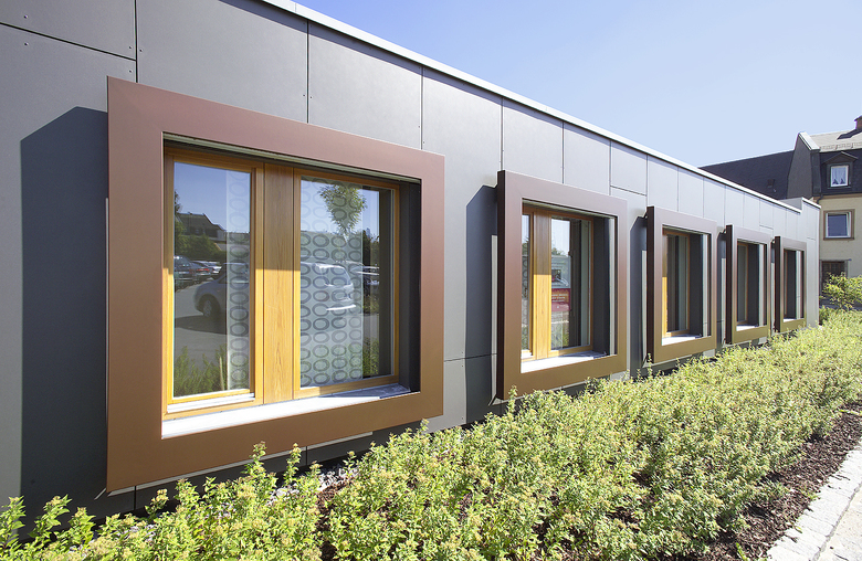 Als Kontrapunkt zu den Holzfenstern wurden die Fenster der Sonderräume wie Ecklaterne, Eingangs- und Werbeelement als Leichtmetallfassade ausgeführt. Flächigkeit und Farbigkeit der Elemente unterstreichen den umhüllenden Charakter der Außenbekleidung.