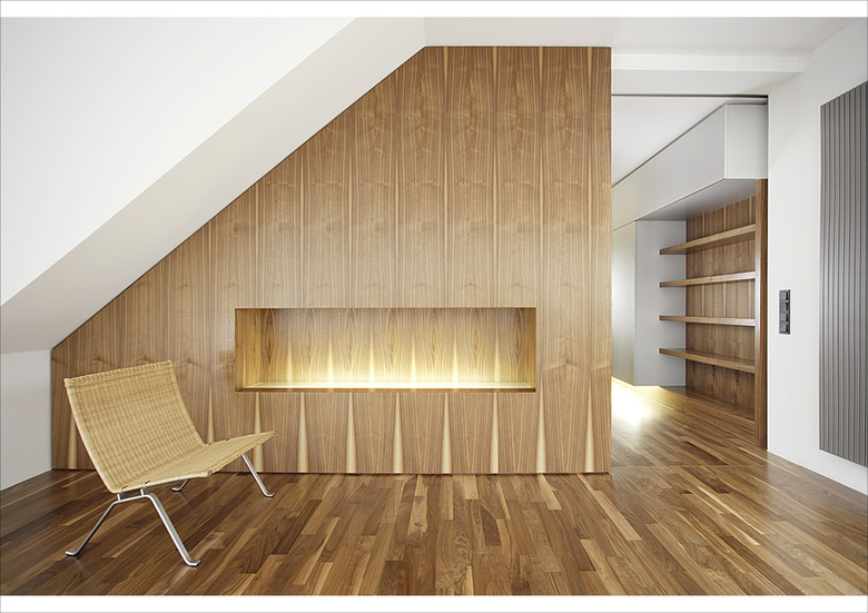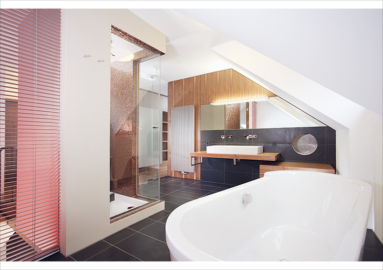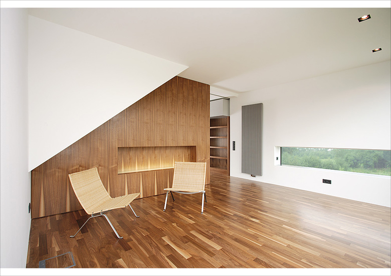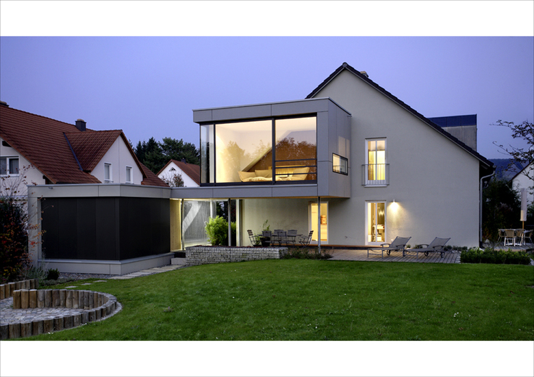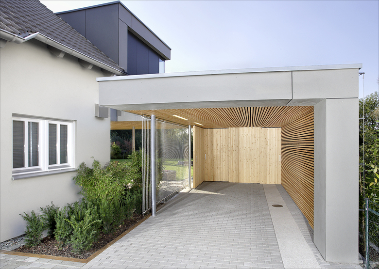 Die Nachverdichtung schafft zusätzliche Nutzflächen und gibt dem Bauwerk eine moderne Prägung. Durch markante Zubauten und interne Umstrukturierungen wird die konventionelle Doppelhaushälfte überformt, um dem Bauherrn den Wunsch nach Charakter und angenehmer Stimmung seines Wohnhauses zu erfüllen. Der Zubau im Obergeschoss ermöglicht einen Wellness-Bereich, bestehend aus Sauna, großzügigem Bad und einen Multifunktionsraum mit traumhaften Bezug zum westlich gelegenen Naturschutzgebiet. Carport und Geräteraum werden mit dem aufgeständerten Zubau verbunden und schaffen einen gedeckten Sitzplatz mit logischer Verschmelzung von Innen- und Außenraum.