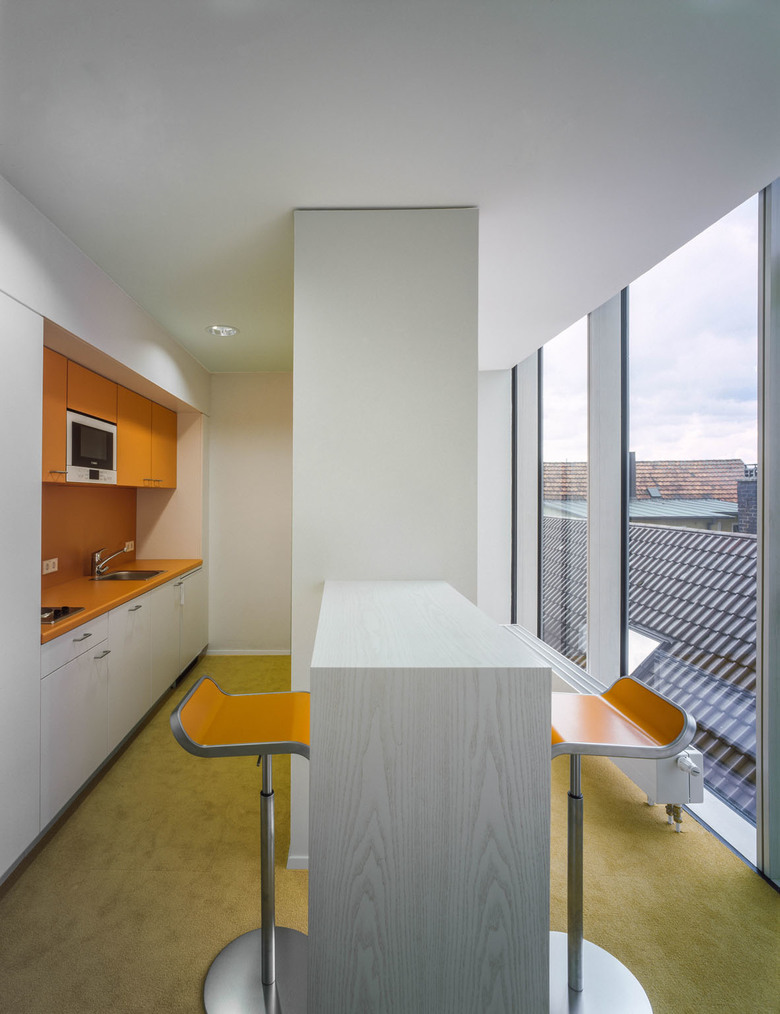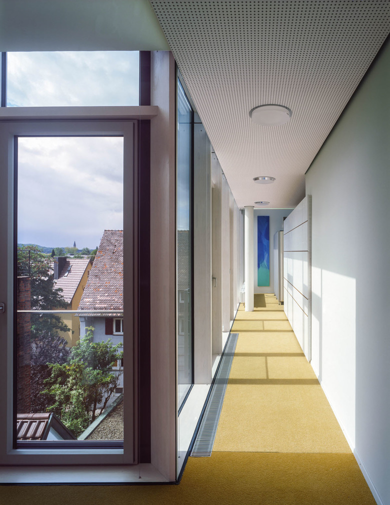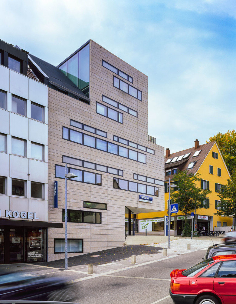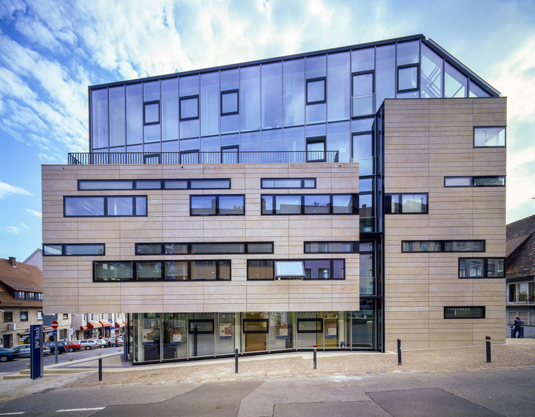 Aufgrund der besonderen Lage und der Ecksituation orientiert sich der Neubau an den bestehenden Nachbargebäuden in der Höhenentwicklung und fügt sich so selbstverständlich ein. Formal wurde aus der Grundfigur eines Quaders Teilstücke entnommen, die Bezüge zu der umgebenden Bebauung entwickeln. Die eingeschnittenen Flächen sind transparent, die ursprünglichen Außenflächen wirken massiv und sind einheitlich mit Naturstein verkleidet. Das Konzept der Einschnitte in einen geometrischen Körper wurde bis ins Detail konsequent umgesetzt.