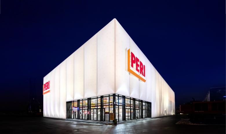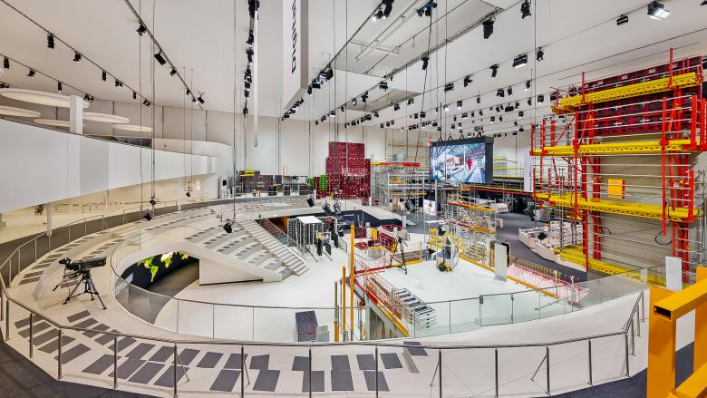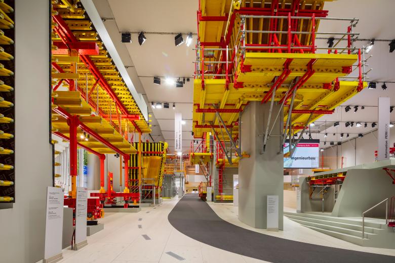 Die Ausstellung wird durch einen ovalen Luftraum geprägt, welcher von Rampe, Tribüne und Freitreppe gerahmt ist und einen zentralen Markplatz als Showfläche ausbildet.Der Marktplatz gliedert sich in vier Bereiche entsprechend den Sparten von PERI. Im östlichen Doppelstock befinden sich eine Installationsspange, Technikräume und Lager. Der westliche Bereich hingegen ist für die Exponate reserviert, welche für eine bessere Übersichtlichkeit zur Fassade hin höhentechnisch abgestuft sind.