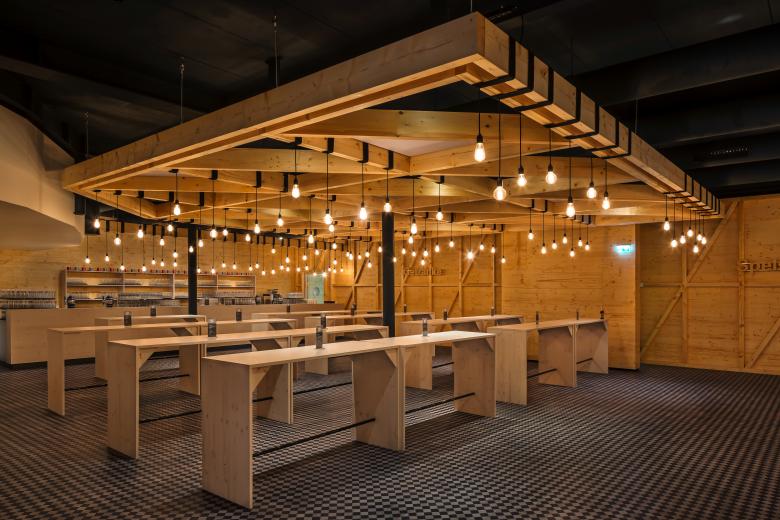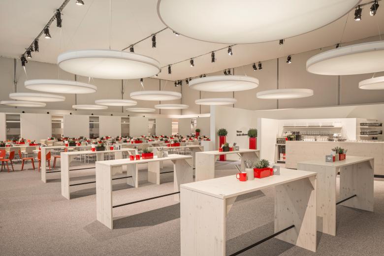 Im ersten Stockwerk befindet sich an der Rampe und neben der Tribüne eine Nische mit dem Digital-Solution-Bereich. Des Weiteren gibt es hier den Aufgang auf die zweite Ebene in welcher sich ein separater Cateringbereich mit eigener Küche und Besprechungskabinen befindet.