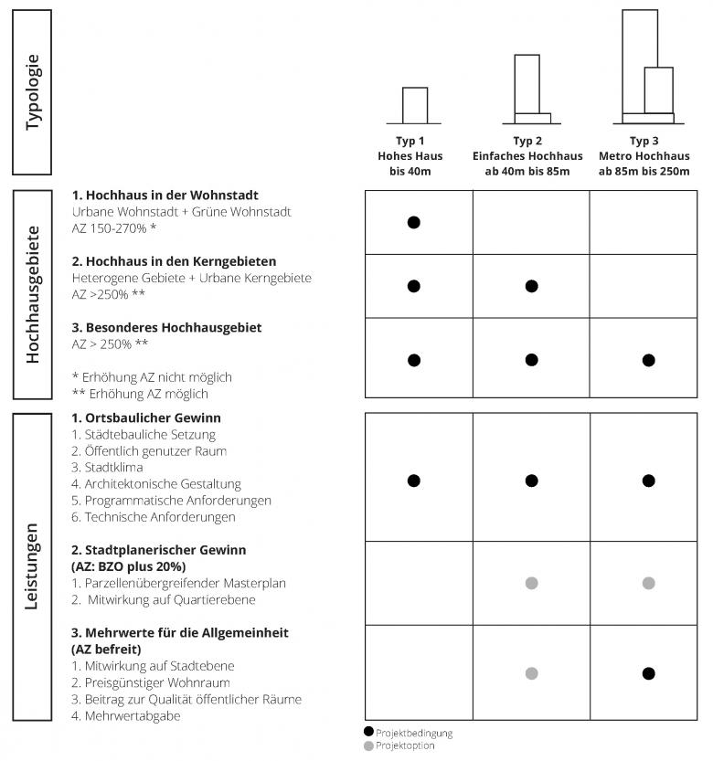 A matrix was developed that differentiates high-rise buildings into three types. Each type may only be built in certain areas and, with increasing height and complexity, must fulfil increasing requirements to benefit the sur-rounding area or even the general public.