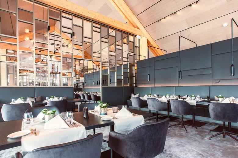 Geheimnisvoll und dunkel gibt sich das Restaurant ÖSCH NOIR. Hier können französische Spezialitäten genossen werden. In dem seit Frühjahr 2021 mit einem 2. Michelin Stern ausgezeichneten Gourmet Restaurant wurden die Schlitzdurchlässe INDUL geschickt am Übergang zweier unterschiedlicher Deckenbereiche installiert. Im Ergebnis optisch zurückhaltet und dezent - jedoch mit einer optimalen lufttechnischen Wirkung mittig im Raum. Die in den Deckenrandbereichen aufgesetzten Holzelemente gehen in die Wandverkleidung über und ergänzen das edle Ambiente um eine leichte rustikale Note. Als elegante Raumteiler rund um die Tische dienen abgehängte Glaskugeln, die im ganzen Raum stilvolle Lichteffekte entstehen lassen.