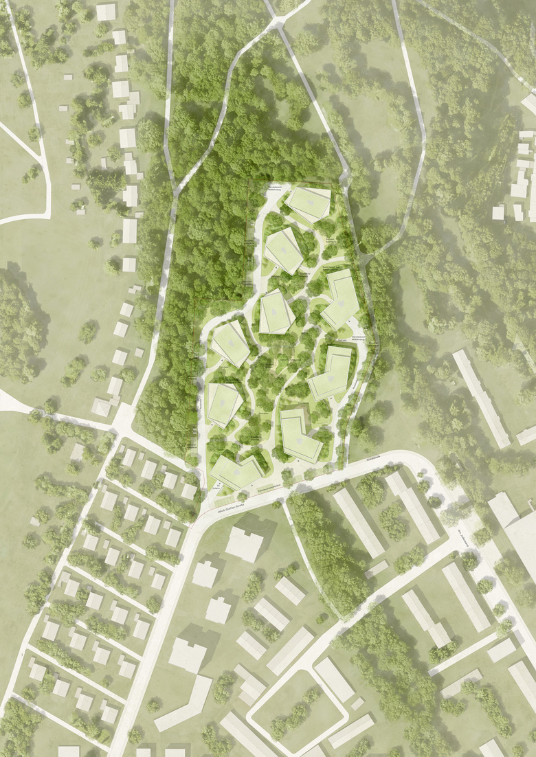 The point of departure for the design is the exceptional natural location of the Hartenbergpark site. The park landscape is extended over the plateau as an identity-forming, green neighbourhood centre around which the urban villas are grouped.