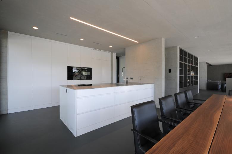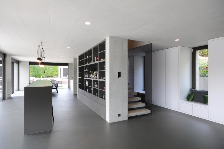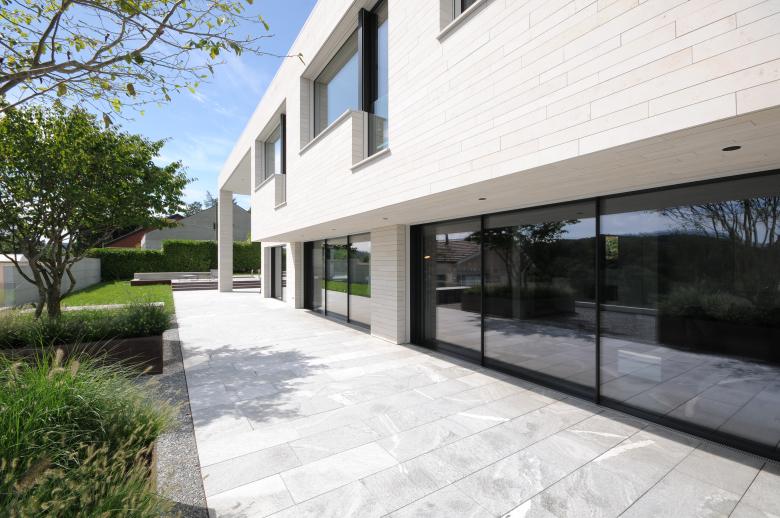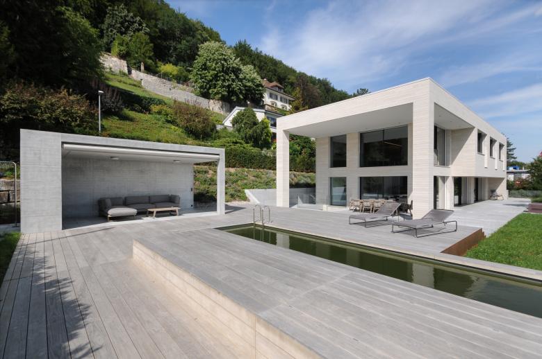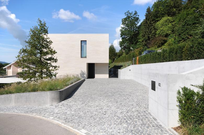 An der attraktivsten Südhanglage in Aarau entstand als Ersatzneubau ein hochwertiges Einfamilienhaus mit grosszügiger Gartenanlage. Die charakteristischen topographischen Terrassierungen und Hangkanten des ehemaligen Aarauer Rebberges konnten für den Neubau optimal ausgenutzt werden. So steht das Gebäude selbstverständlich als schlichter Kubus auf dem bestehenden Plateau und ermöglicht die grosszügige Aussicht in den grünen Aareraum. Die geradlinige, kubische Architektursprache mit einer Fassadenhülle aus einem erlesenen hinterlüfteten Naturstein überzeugt als eigenständiger Beitrag in der heterogenen Umgebung.