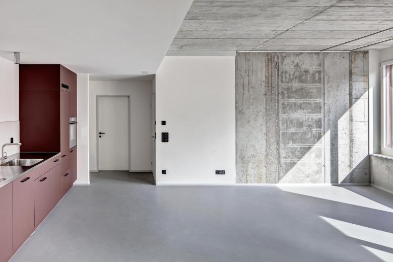 Acht individuelle 2,5 bis 3,5-Zimmer-Wohnungen, sowie eine 6.5-Zimmer-Wohnung, welche als Gross-WG dient, fügen sich um die bestehenden Kerne. Farblich bilden die Rottöne verschiedener Oberflächen einen Kontrast zu den bestehenden Sichtbetonwänden und -decken.