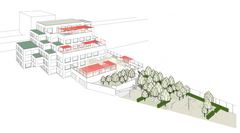 Die Terrassen des gestuften Baukörpers sind im Konzept als Pausen -und Nutzräume für den Unterricht geplant und werden auch so genutzt. Um vor allem in den oberen Geschossen die Nutzungsoptionen aufgrund des Wärmeeintrages zu vergrößern, wurde von Seiten Nutzer:innen ein Projekt zur Beschattung dieser Terrassen angestoßen. Über differenzierte Studien zeigte sich der Vorteil von lamellenartigen, luftdurchspülten und schattenspendenden Elementen, die im Sinne eines klaren Statements durch die Architekt:innen als Re-Use-Elemente definiert wurden. So entsteht eine räumlich präzise Setzung der Schattendächer auf verschiedenen Ebenen auf das mehrfach preisgekrönte Projekt. Gleichzeitig werden zusätzliche Spielangebote geschaffen, die sich unter den neuen Schattendächer entspannt entwickeln können.