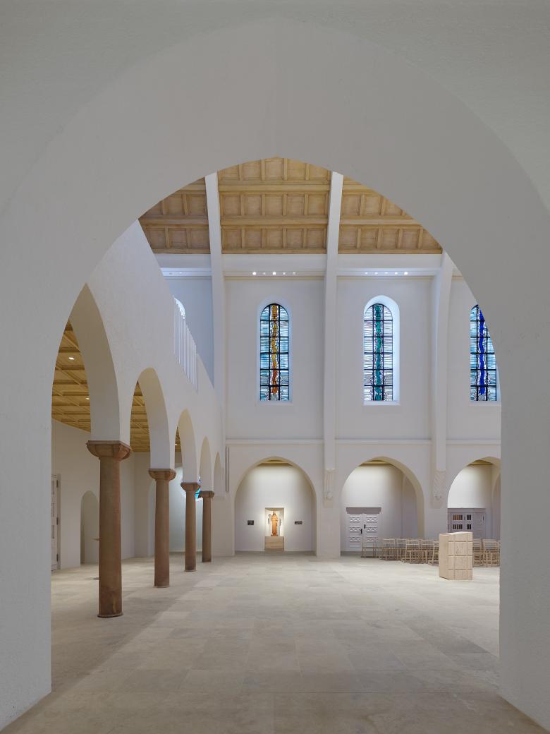 Der Fußboden aus Travertin und die diskrete hölzerne Kassettendecke sorgen für ein einheitliches Befinden. Der Stuttgarter Künstler Martin Bruno Schmid zeichnet für die liturgischen Elemente aus einem einzigen Kalksteinmonolith verantwortlich. Zur unbeschwerten Lichtatmosphäre tragen auch die von Georg Meistermann geschaffenen Farbglasfenster bei. Das Konzept für die künstliche Beleuchtung des Baus stammt vom Studio Lunalicht. In den Nachtstunden wird die Hauptbeleuchtung des Mittelschiffs von Einbauleuchten an den Deckenseiten gewährleistet. Die einzelnen Lichtkegel der quadratisch schwenkbaren Laser Blade XL wurden so ausgerichtet, dass sie am Boden einen gleichmäßigen Lichtteppich erzeugen, der in der Lichtintensität gezielt beeinflusst werden kann.