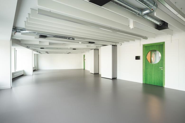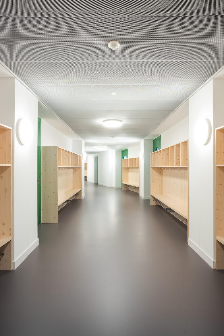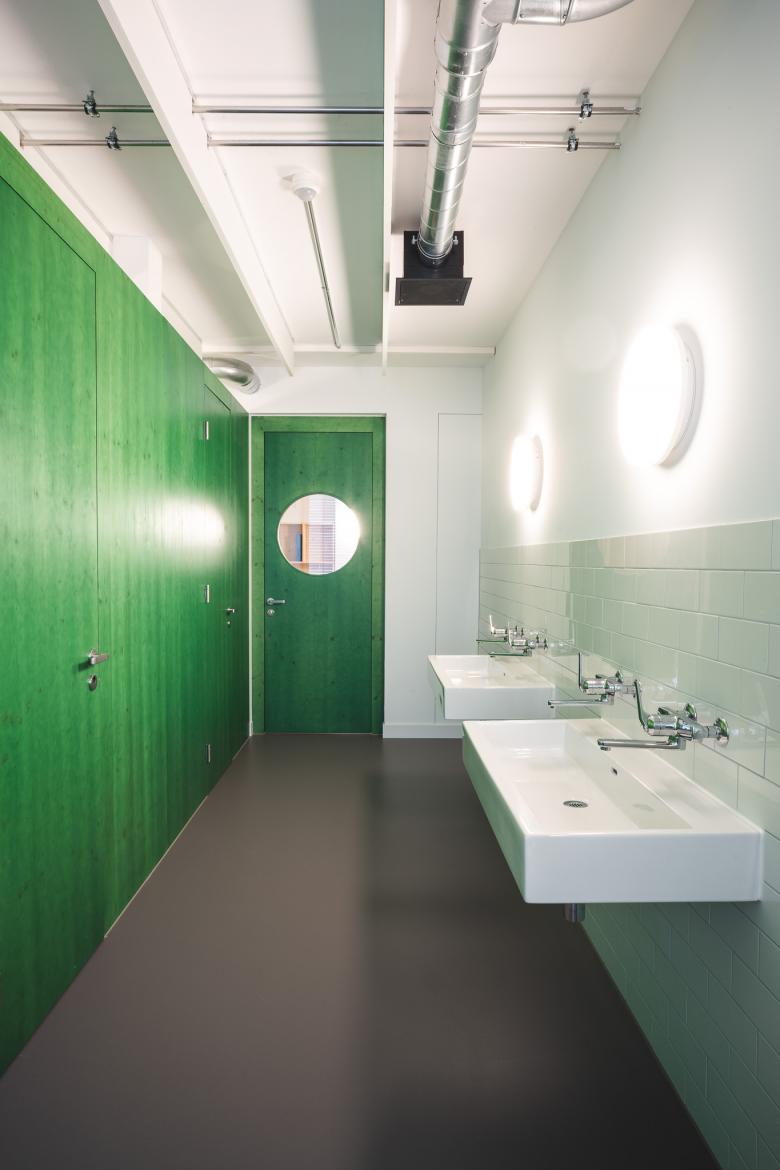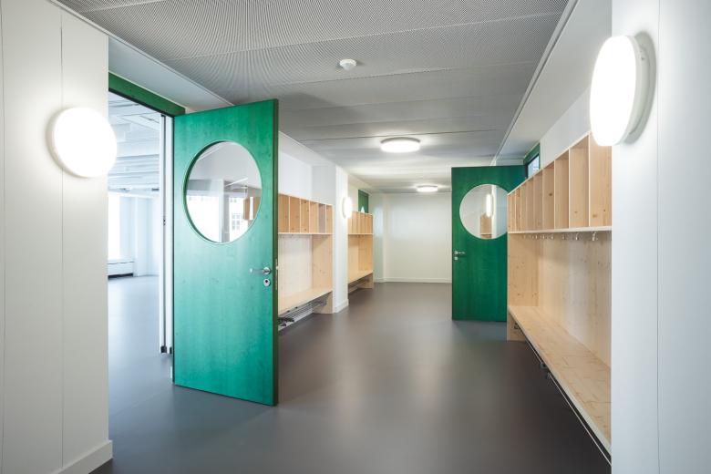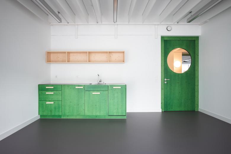 Mit einem frischen Grünton und naturbelassenen Holz wurde ein klarer Kontrast zur Büro-Umgebung geschaffen. Die Kinder sollen die Andersartigkeit bewusst wahrnehmen und als Identität erfahren.