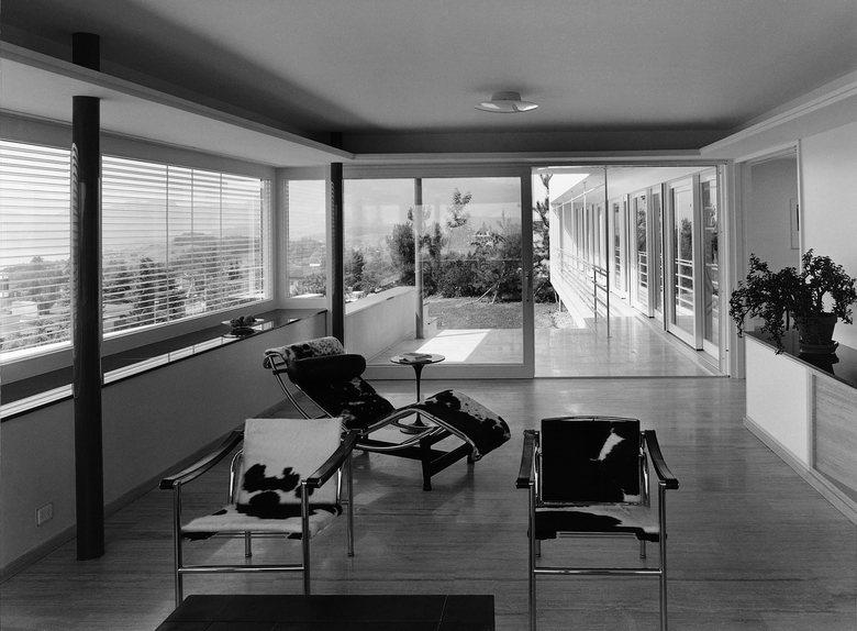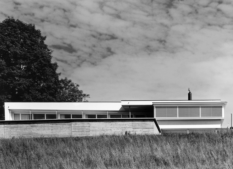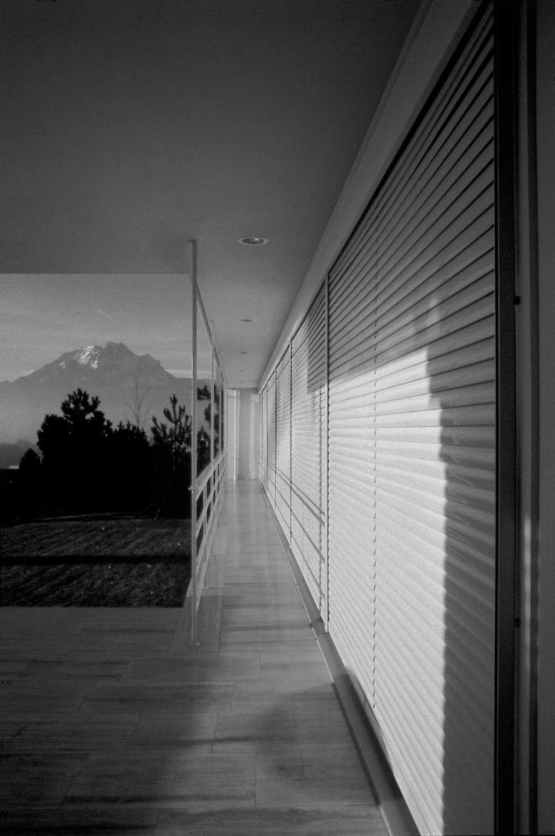 Die Aufgabe bestand darin, ein Einfamilien-haus zu projektieren, welches auf 170 Quadratmetern Bruttogeschossfläche mindestens fünf Räume beherbergen konnte. Die prominent gelegene, teure Parzelle mit Südlage und Alpensicht, deren Ausnützungs-ziffer sehr niedrig ist, befindet sich in einem Einfamilienhausquartier mit rigorosem Gestaltungsplan. Der Neubau zeigt sich als Fragment eines traditionellen Giebelhauses, welches mit Mitteln der modernen Architektur konstruiert wird. Die moderne Umsetzung erlaubte es, räumliche Beziehungen zwischen innen und aussen so zu intensivieren, dass trotz der stark beschränkten Wohnfläche eine grosszügig wirkende Anlage entstehen konnte. Die Materialisierung im Innenbereich des Wohngeschosses ist geprägt von einem an Ort geschliffenen florentinischen Travertin, welcher sich bis in den Aussenbereich der Terrasse und des Vorplatzes als Bodenschicht hinzieht. Brüstungsabdeckungen und Gesimse sind aus poliertem belgischem Granit. Die Wände wirken hautartig glatt, der Weissputz wurde mit einer Seidenglanzfarbe weisslich gespritzt.