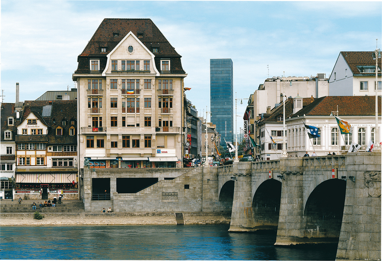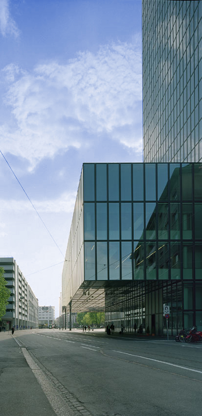 Im Zusammenhang mit dem Standortentscheid einer Erweiterung wurde das Konzept «Messe Basel plus» ausgearbeitet. Die Zielfestlegung bestand darin, die logistischen, funktionalen und städteräumlichen Defizite aufzuwiegen und ein neues identitätsstiftendes Wahrzeichen für die Messestadt zu etablieren. Ausgangspunkt ist ein Hochhaus. Dieses wurde, wie beim Lever House in New York, mit einem podiumsähnlichen Sockel ergänzt, welcher ca. sieben Meter vom Boden abgehoben wurde. Er kragt 12 Meter nach Osten und 24 Meter nach Süden aus. Auf der Achse von der mittleren Rheinbrücke zum Badischen Bahnhof drängt der auskragende Bauteil in das Sichtfeld und perspektiviert den Raum. Der Turm des Hochhauses dagegen überragt als neues Wahrzeichen den Stadtkörper. So wirken die beiden Gebäudeteile städtebaulich aus der Ferne und aus der Nähe. Eine von aussen sichtbare Stahlfachwerkkonstruktion erlaubt, das Innere weitgehend stützenfrei zu halten und überdies das Gewicht des Auslegers zu reduzieren. Plastizität wird durch eine homogene Fassadenhaut erreicht. Die differenten Nutzungen und deren Strukturen sind der transparenten Fassade hinterlegt und thematisieren auf einer zweiten Wahrnehmungsebene die räumliche Tiefenwirkung des Gebäudes.