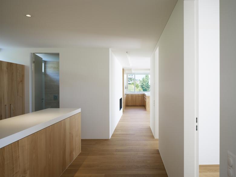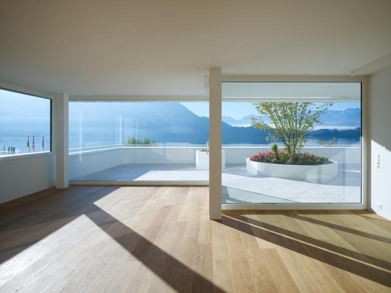 Räumlich zeigen sich die Wohnungen als fliessender Innenraum, welcher vom Eingang zum Wohn- Essraum bis hin zur grosszügigen Ankleide vor dem Elternzimmer sich entwickeln und zum begrünten Aussenraum mit Ausblick auf den See und die Berge sich orientieren. Die Materialisierung des Gebäudes ist charakterisiert von einer durchgehenden Gestaltung der Fassaden mit weissem Kratzputz, von weiss einbrennlackierten Fensterdetails und Brüstungsgeländern. Im Innenraum herrschen warme Materialien vor, wie Eichenbretterparkett und mit Kastanienholz furnierte Einbauschränke und Küchenfronten. Die Wand- und Bodenbeläge in den Bädern sowie auf den Terrassen sind mit grossformatigen Travertinplatten belegt. Die Anlage weist vier Geschosse auf, welche im Erdgeschoss den Hauszugang mit Briefkasten, Container, Fahrradeinstellplätze sowie acht Autoparkplätze aufweist. Die drei Vier-Zimmerwohnung mit grosszügigen Terrassen werden über einen internen Aufzug von der Garage direkt erschlossen oder können auch von aussen über eine Freitreppe im Garten erreicht werden.