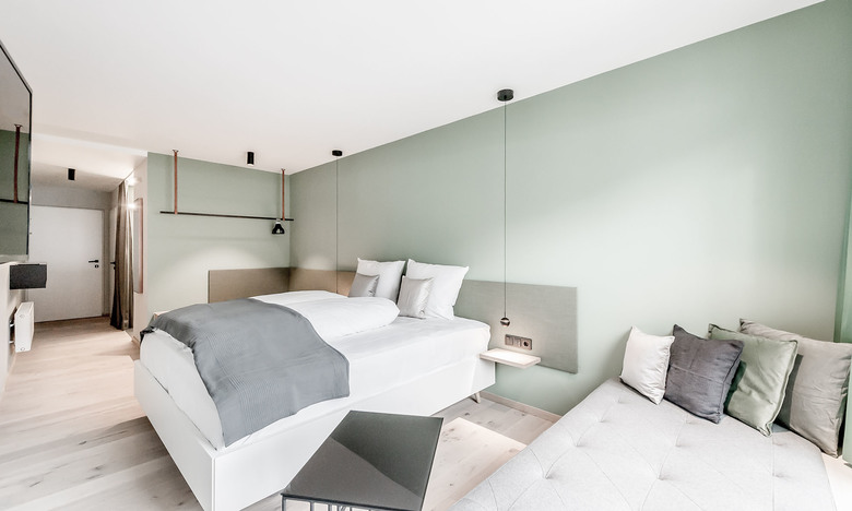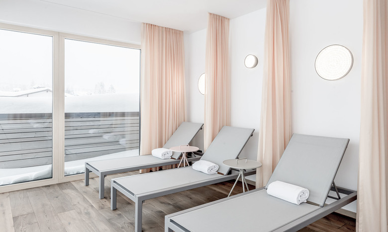 Die Gästezimmer sind universell anspruchsvoll bis ins letzte Detail gestaltet, mit einer kleinen Entspannungszone vor den Fenster und einem herrlichen Ausblick vom Daybed in die Bergwelt Tirols. So komfortabel wie zuhause, aber exklusive Stress und Alltagstrott. Der tägliche Emailcheck ist dank WLAN im Zimmer problemlos möglich. Wer auch im Urlaub arbeiten möchte, kann den kleinen Co-Working Bereich im Dachgeschoss nutzen. Für die anschließende Entspannung sorgt eine Boutiquesauna mit Panoramaruheraum und einer großen Dachterrasse.
