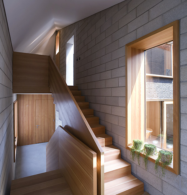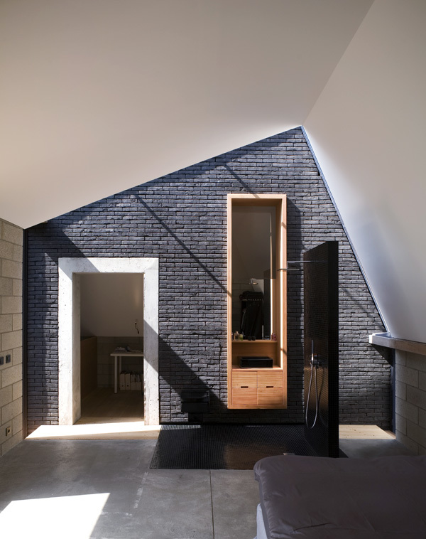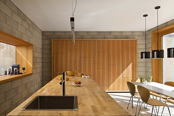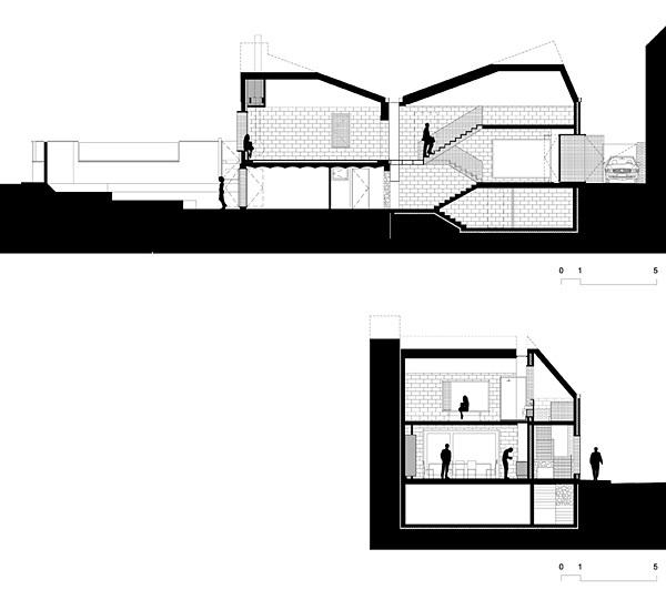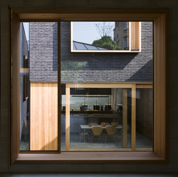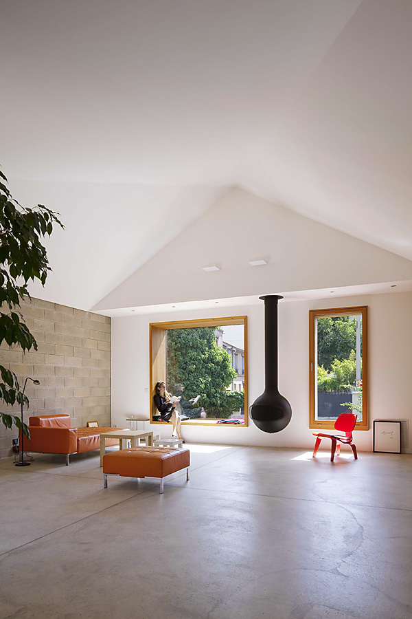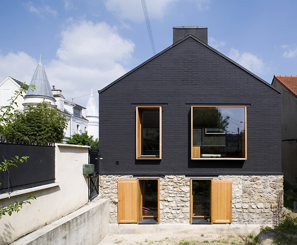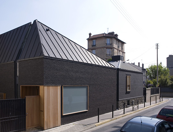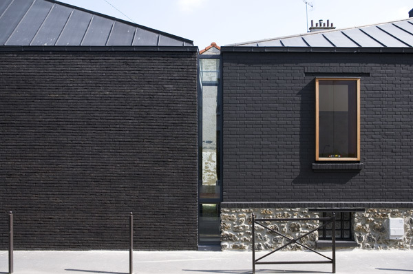 Nous avons choisi, pour perpétuer son caractère pavillonnaire et doubler sa surface, de dupliquer la maison existante en brique et meulière par l’adjonction latérale de deux volumes, deux «clones» disposés en équerre au nord du terrain à l’emplacement d’un ancien appentis. Cette implantation permet de créer un nouvel ensemble homogène autour d’un jardin intérieur tout en respectant l’alignement sur la rue. La nouvelle habitation est composée de trois volumes élémentaires dissociés, un carré et deux rectangles, qui sont reliés par deux interstices vitrés et se raccordent au niveau des arêtes de leurs toitures. Avec son nouveau toit tronqué qui laisse pénétrer la lumière du sud à l’intérieur des espaces créés au nord, la « cellule souche » tend à se confondre avec son extension par sa géométrie, ses matériaux et la modénature de ses baies au point qu’il devient difficile de distinguer le nouveau de l’ancien. La brique porteuse du pavillon d’origine est utilisée dans l’extension comme protection de l’isolation par l’extérieur, tandis que le parpaing brut qui est porteur dans l’extension vient doubler les murs existants isolés par l’intérieur. Pour parfaire cette fusion, de grands caissons en mélèze intégrant les baies vitrées transpercent indifféremment les trois volumes, offrant des échappées visuelles à travers la maison et son jardin de part en part selon l’axe nord-sud.