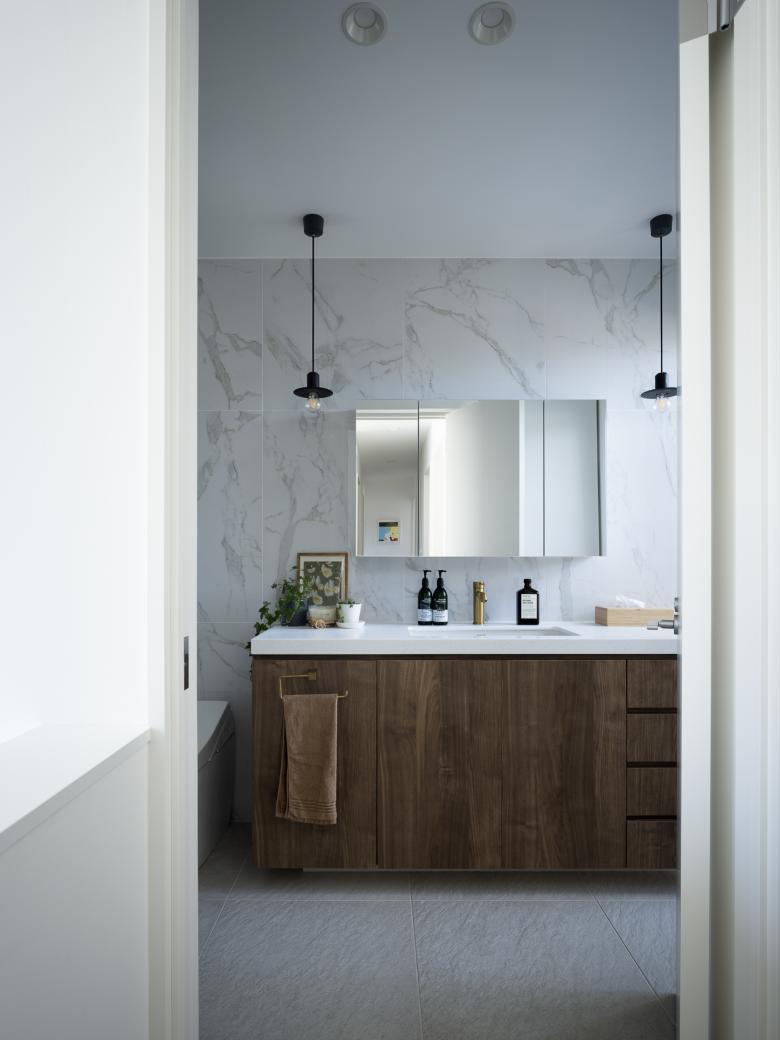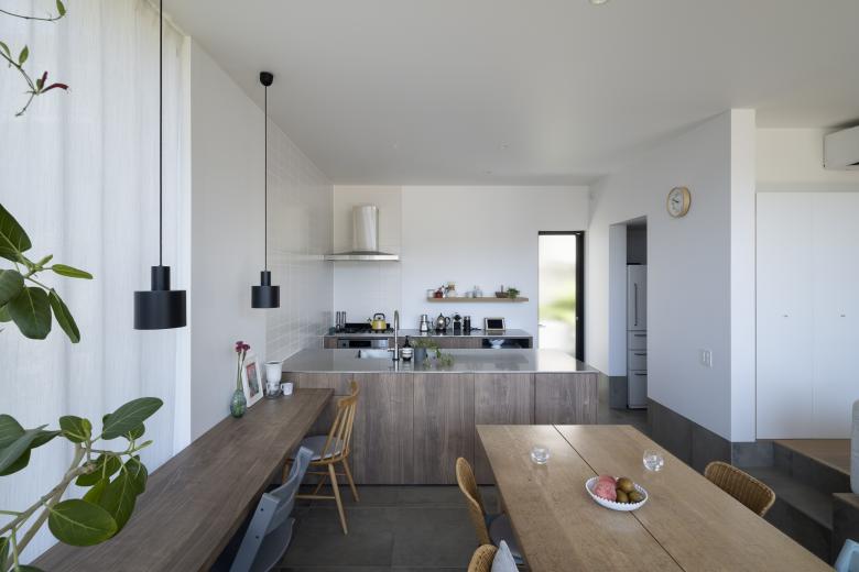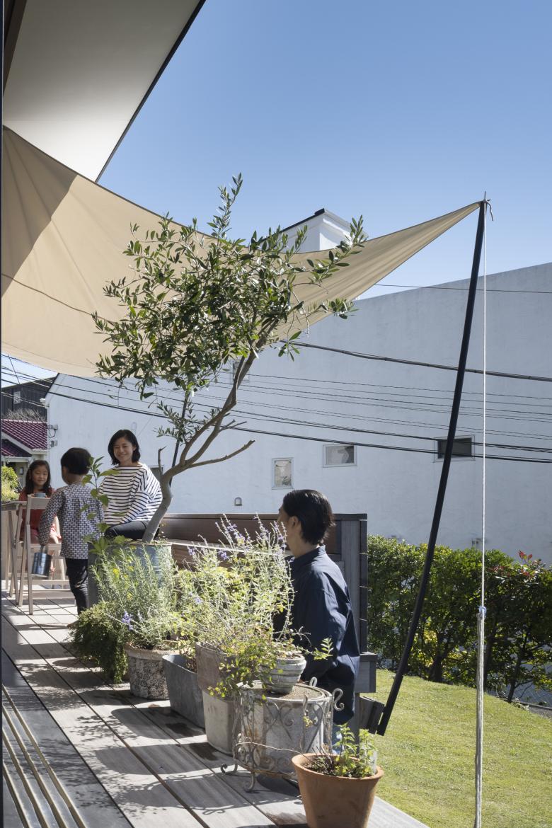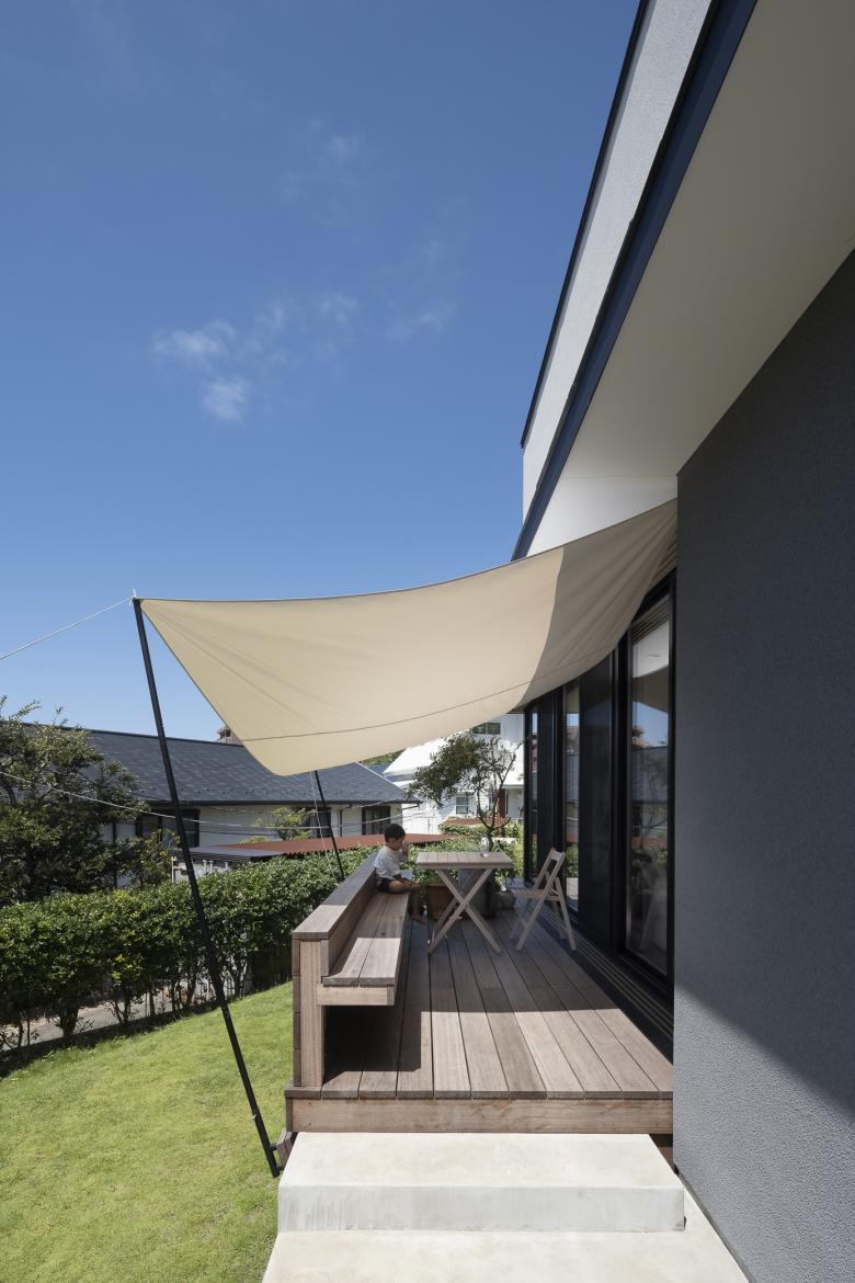 Although there is no ocean view, the environment is rich in nature, surrounded by the sea and mountains unique to Hayama. The LDK is located on the first floor, and the private rooms and water area are located on the second floor. For the husband, who is also a surfer, and the family who have taken up SUP, we created a space closely related to daily life with an outside shower, a deck with a tarp on which they can enjoy meals in their swimsuits, an entrance with a mortar finish to prevent sand from getting in, and a tiled dining kitchen that can be accessed directly from the outside shower. The composition and choice of materials resulted in a house that matches the relaxing atmosphere typical of Hayama.