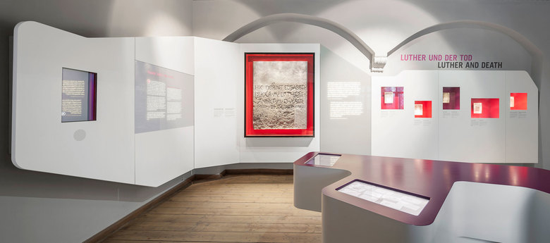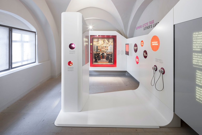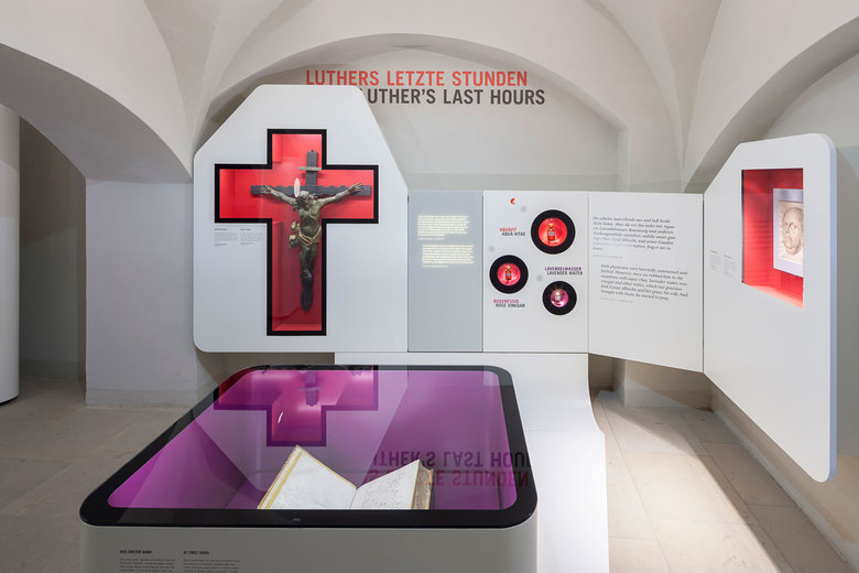 Der nahezu barrierefreie Ausstellungsrundgang des neuen Museum Luthers Sterbehaus führt durch das sanierte historische Sterbehaus und einen Museumsneubau. Auf 500 qm wird Luthers Verhältnis zum Tod und sein Einfluss auf die Sterbekultur thematisiert und anhand ausgewählter Exponate erläutert.