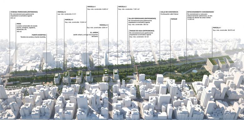 The project won the First Prize in the National Ideas Competition unanimously by the jury. The proposal selected among 47 participants was the only one that made a counterintuitive proposal, placing the buildings perpendicular to the tracks, minimizing the impact on the neighbors and maximizing sale prices of the new units. All this improving the requested metrics and bringing public space from 65% to 78%.