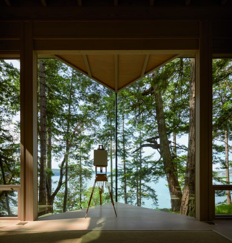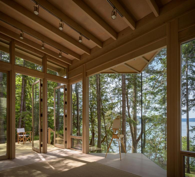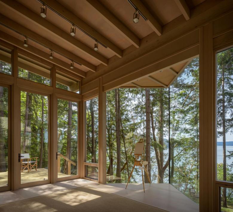 “I think of this studio as a ‘child’ of the ‘mother house’ up the hillside. Each has a triangular bay window that helps you to feel as if you are floating over the bluff, one with the treetops and water below. The owner has been inspired to do some beautiful watercolors there.” –Jim Olson, FAIA, Design Principal
