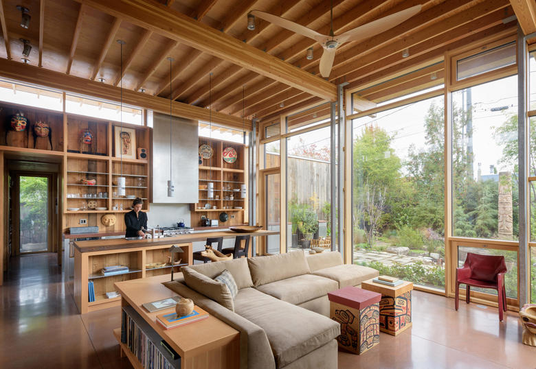 The 2,400-square-foot home is organized around a central gathering space with two wings extending from it: one with the master suite and the other containing the guest room and storage areas. The heart of the home in plan as well as function, the central area, which consists of an open kitchen and living space, is a single volume defined by a 16-foot-high ceiling and full-height window walls.