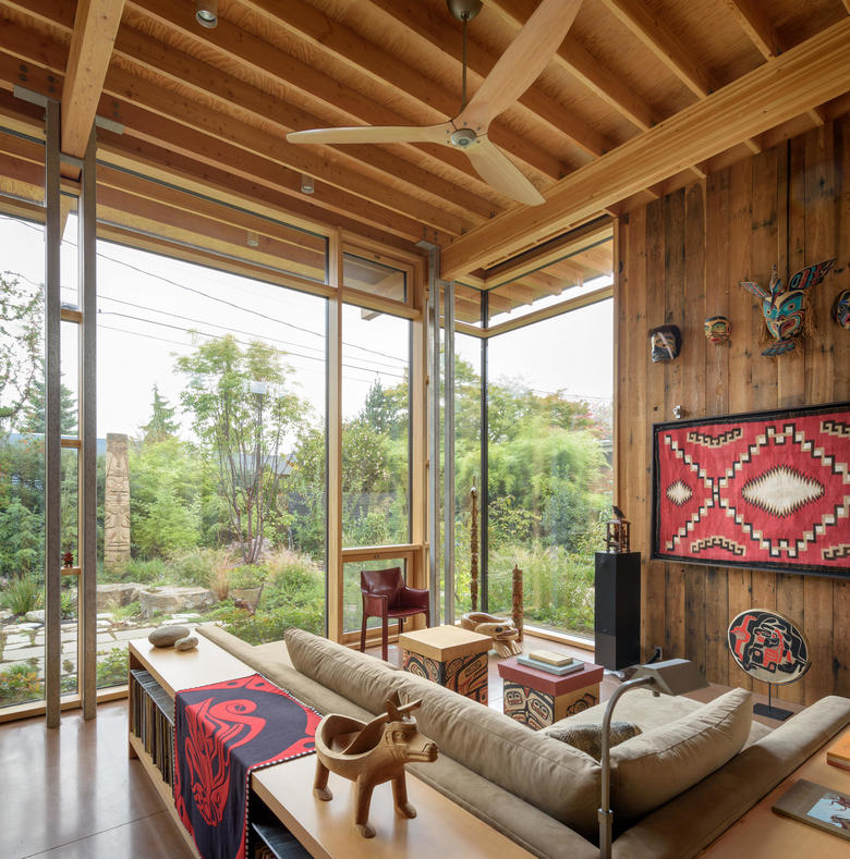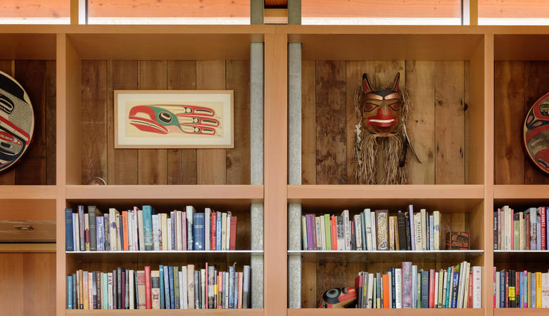 The interior palette draws inspiration from the client’s extensive Native American art collection with custom tinted red concrete floors and natural, unstained plywood walls and ceilings. Reclaimed fir siding and galvanized steel roofing continue the emphasis on sustainability and economy. The house incorporates several green strategies such as a green roof, photovoltaic panels and an air-to-water heat pump, reflecting the client’s longstanding engagement with environmental conservation.