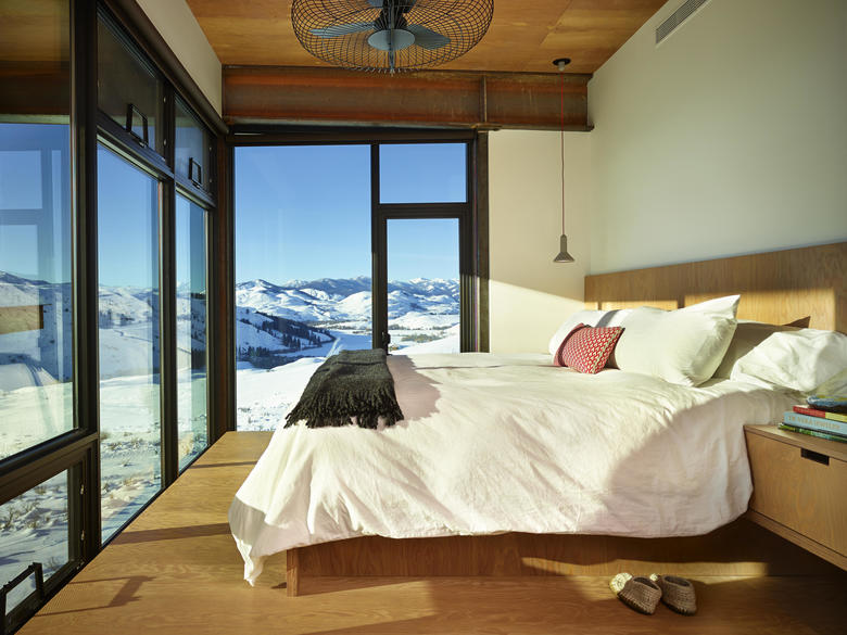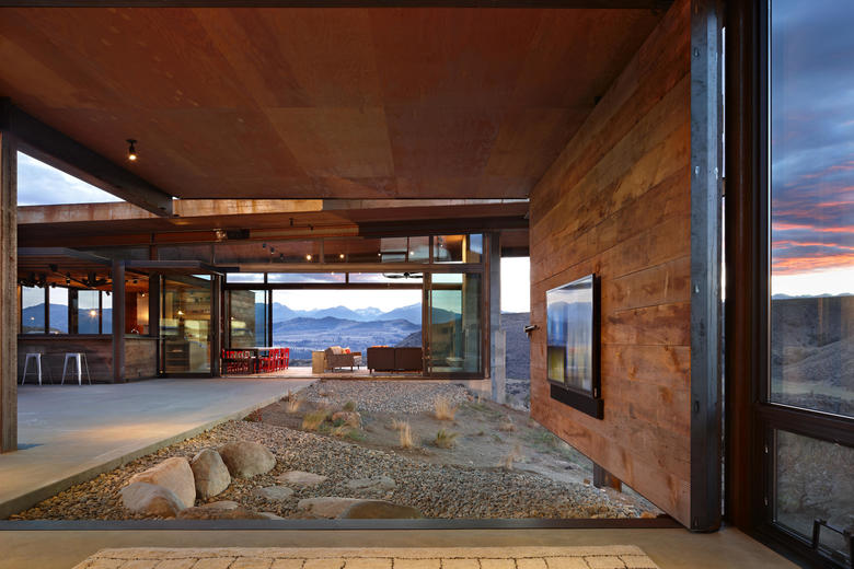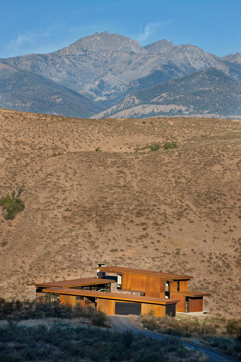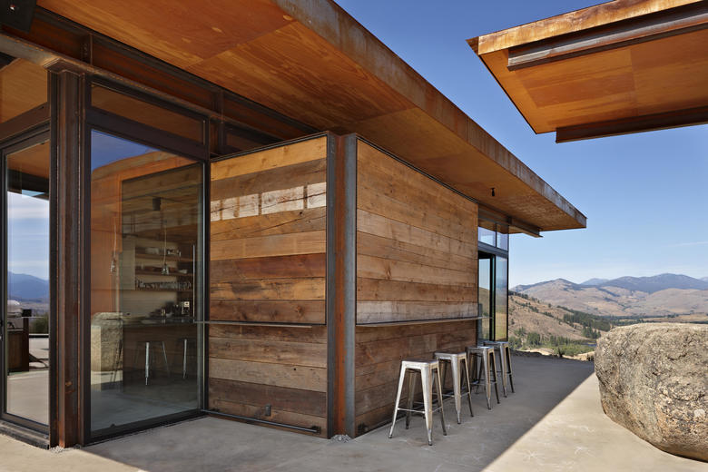 Tough building materials, mostly steel and glass, were utilized to stand up to the equally tough environmental conditions – from hot, fire-prone summers to winters with heavy snow pack. The wood siding was salvaged from an old barn in nearby Spokane, WA. Over time as the wood and steel weather, the home will become more and more muted in appearance, further blending into the landscape.