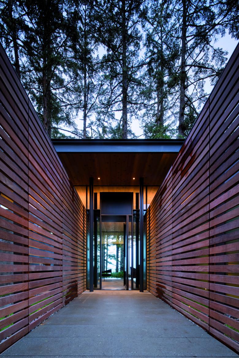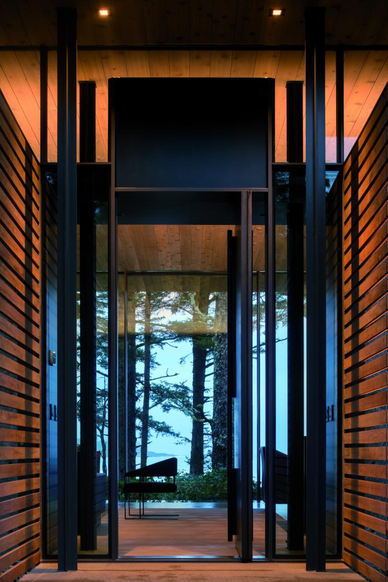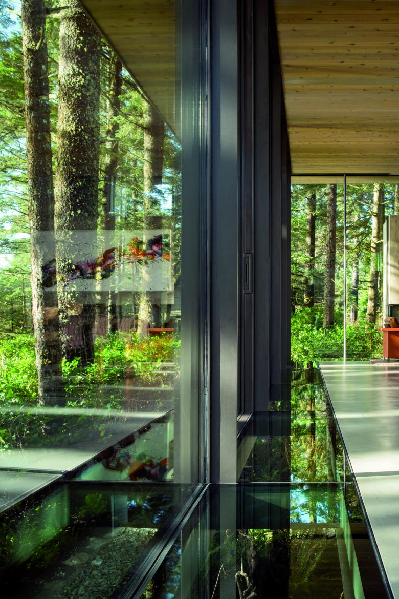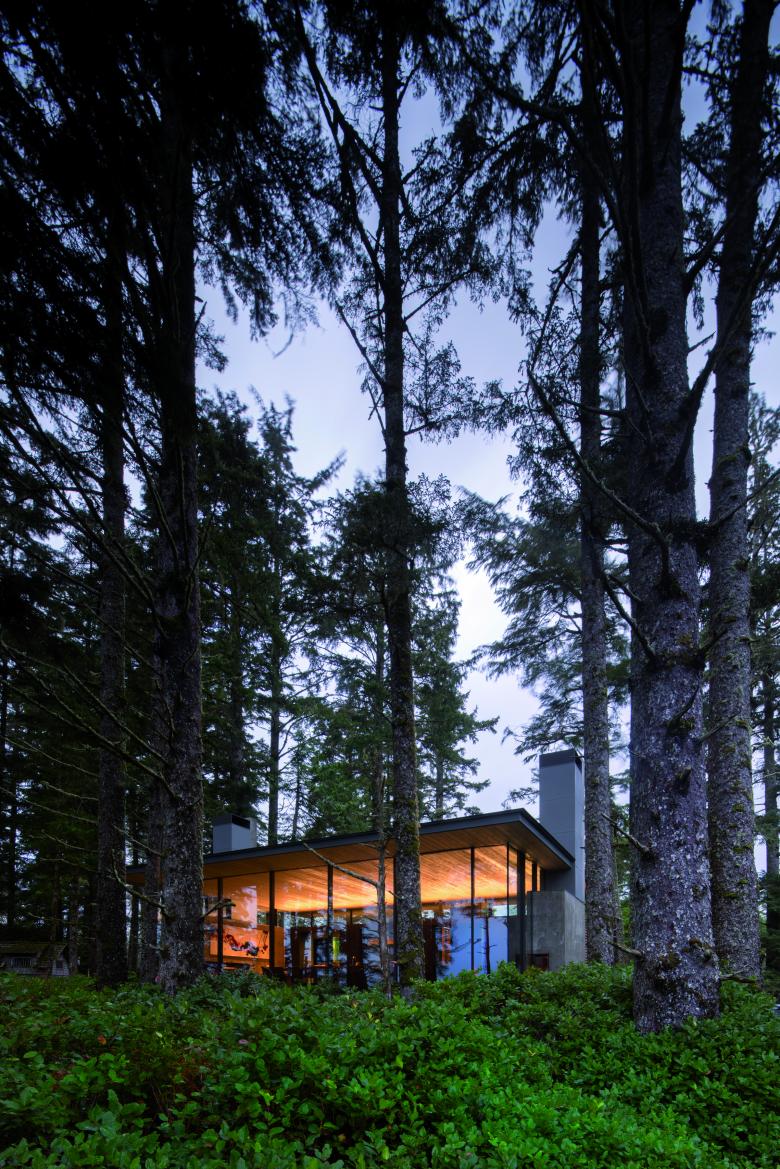 Glass walls open the living area to panoramic views of forest and ocean, while two fireplaces on either end anchor the space and provide a feeling of refuge. Cantilevering the house from its base provides space for ferns and beach salal to grow underneath the glass flooring that runs the perimeter of the main room, giving the sense of floating above the forest floor.