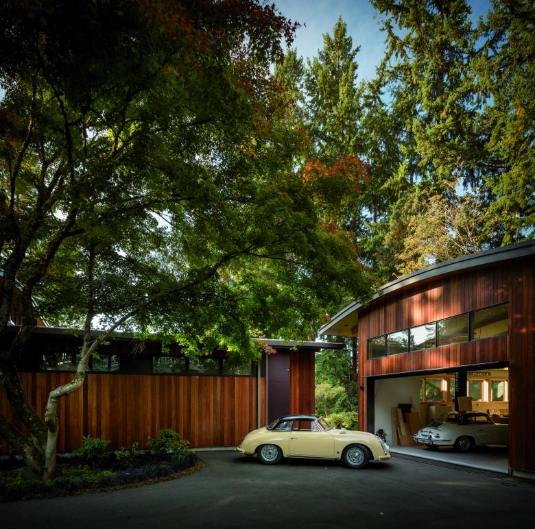 Inside, a vaulted, double-height main living area creates a casual and flexible gathering space for the family. This space features high windows to capture daylight, as well as a wall of full-height windows oriented to the view of Lake Washington and beyond. A loft above the kitchen, partially suspended from the roof structure, creates additional flexible space for gathering and play. The adjacent detached garage continues the home’s sculptural language with a curving roofline and high windows. Vaulted ceilings further echo the bright and airy interior of the home’s main living space. The garage provides a bright and airy workspace that supports the owner’s passion for restoring classic cars, as well as weather-protected storage.