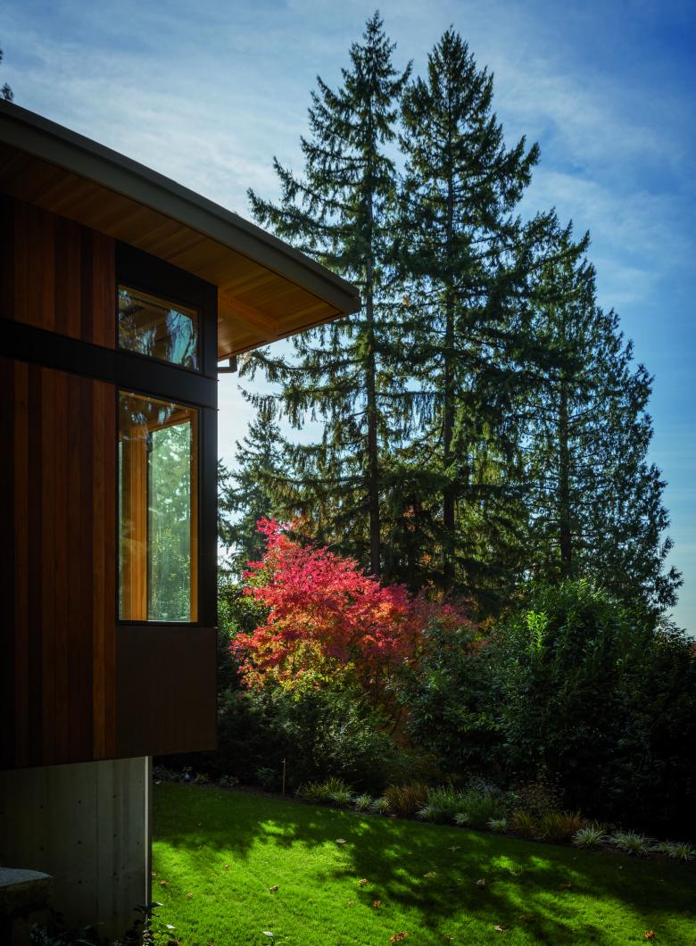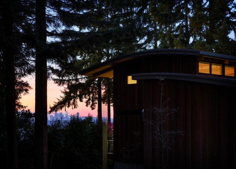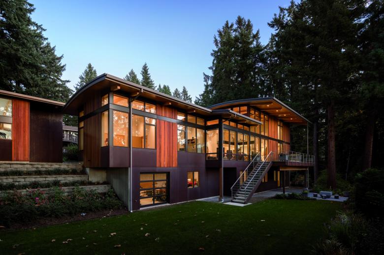 This single-family home for a couple with young children provides an open, flexible living space that supports family life, as well as an adjacent workshop and garage for the owner’s avid interest in car restoration. Gently curved roof forms are inspired by the topography of the site and Lake Washington’s undulating shoreline, creating a sculptural grouping of buildings on the site. A light approach to landscape preserves the site’s existing trees, including a Japanese maple that frames the front entry. Durable materials provide long-term, low-maintenance protection against the wet climate.