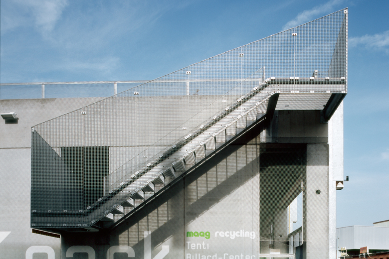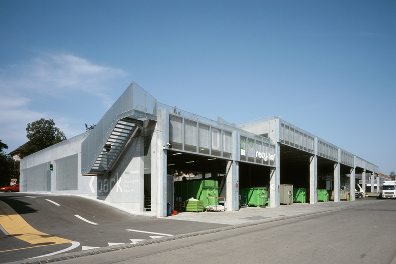 Der Gebäudekörper präsentiert sich als skulpturales, städtebauliches Passstück. Ausdruck und Form des Neubaus sind eine subtile Reaktion auf die gewachsene städtebauliche Situation und klare Interpretation respektive Verteilung der fünf Programme - Recyclinghof, Lagerhalle, Werkstatt, Park und Parkdeck.