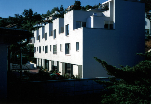 abgebrochen und auf deren Untergeschoss ein neues Reihenhaus erstellt. Das stehengelassene Untergeschoss wurde zur Tiefgarage umgenutzt, welche gleichzeitig das Reihenhaus wie die Lofts bedient. Darüber entstand eine Art Hof, der als Erschliessung dient und von allen genutzt werden kann. Hier begegnet sich Alt und Neu und es entsteht ein Treffpunkt für alle Bewohner.