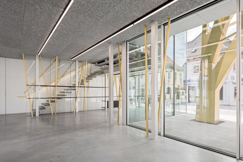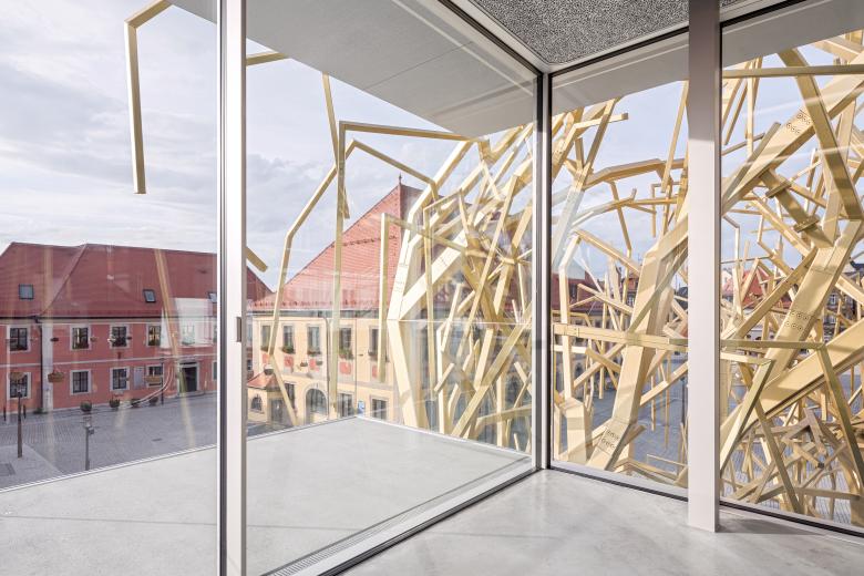 Für den barocken Stadtplatz konzipierte Peter Haimerl ein neues Gebäude als eine rundum verglaste Stahlkonstruktion, die einen historischen Bestandsbau ersetzt und dessen saniertes Kellergewölbe nutzt. Es bildet den städtebaulichen Abschluss des Hauptplatzes sowie des Seitenplatzes und führt an dieser Stelle einen wichtigen Stadtbaustein fort und ersetzt innovativ die in historischen Städten üblichen geschlossenen Raumlinien.