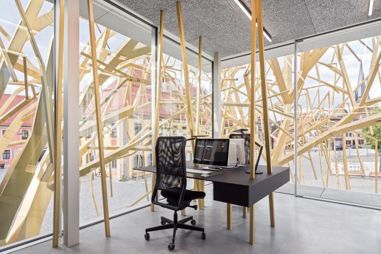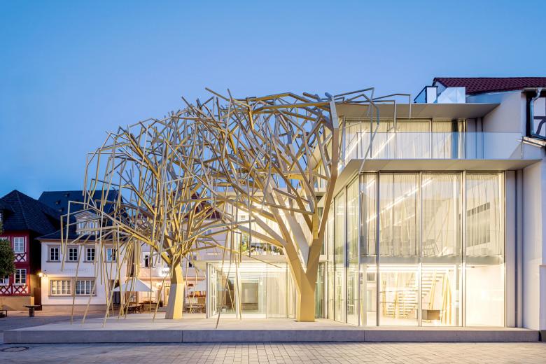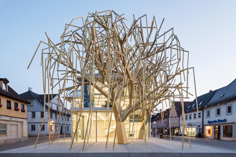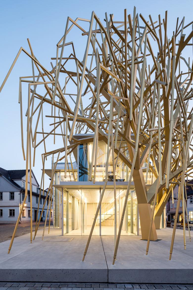 Mit seiner Rundumverglasung, minimalen Rahmenprofilen und Vordächern sowie den schlanken Metallstützen im Inneren macht sich der Bau inmitten der historischen Fachwerkhäuser fast unsichtbar. Umgeben wird dieser Glaspavillon von zwei skulpturalen künstlichen Weidenbäumen aus golden glänzendem Metall, die mit einem Wachstumsalgorithmus entwickelt wurden. Dabei wurde das Grundmotiv der Weide und der Korbflechterei in eine 3D-Struktur verwandelt und ein mathematischer Gen-Code entwickelt, der – ähnlich einer realen Weide – Strukturen wie Stämme, Äste und Zweige generiert. Daraufhin wurden die programmierten Weiden mit digitalen und physischen Modellen auf ihre sichere Konstruktion getestet und schließlich mit Vierkantrohren und robotischer Schweißtechnik auf dem Stadtplatz errichtet. Durch die Beschichtung im Duplex-Verfahren auf verzinktem Stahl erhalten die künstlichen Weiden ihren goldenen Glanz. Die historischen Fassaden aus Stein, Putz und Fachwerk werden so in Form von repräsentativ wirkenden technischen, 12 m hohen Baumstrukturen fortgeführt.