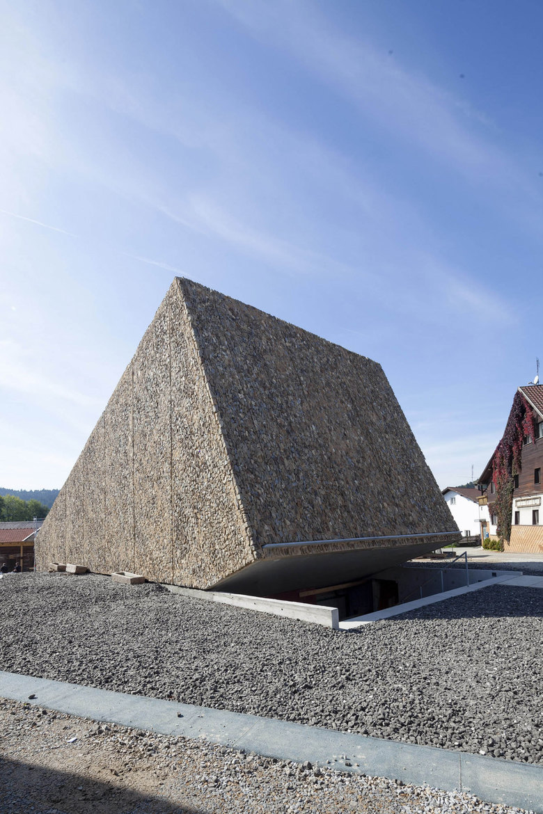 Der monolithische, gekippte Baukörper öffnet sich für die Konzertbesucher auf dem neuen Dorfplatz und führt von dort diese über eine Treppe hinab in das unter der Erdoberfläche liegende Foyer. Dieses erschließt nicht nur die Funktionsräume wie die Garderobe, die Sanitärräume sowie den Barbereich, sondern führt auch spannungsreich um den Zuschauerraum herum ins Innere des Konzertsaales. Dieser entfaltet seine Akustik innerhalb des leicht wirkenden Betonkörpers, dessen präzise Lichtschlitze den Raum beleuchten. Der Baukörper des Konzertsaales ist in Ortbeton gefertigt, dessen diffizile Form nur mittels einer äußert aufwändig konstruierten Schalung realisiert werden konnte. Die dominanten gekippten Oberflächen des Konzertsaales sind allein akustischen Vorgaben geschuldet und beinhalten hinter ihren Schlitzen neben LED-Leuchten auch Bassabsorber, die eine optimale Akustik bieten. Der Beton im Inneren des Konzertsaals ist unbehandelt. Seine lebendigen Oberflächen dienen dazu, die mittelhohen Töne zu absorbieren. Die Schräge des Baukörpers - bedingt durch die Steigung des Hanges - trägt die Zuschauertribüne, deren transparent wirkenden Stühle über Lichtschlitzen zu schweben scheinen. Die Stühle sind auf Eisenschwertern aus Stahl, auch unter den Stufengängen sind Absorber eingebaut. Die Bühne des nicht als Multifunktionsraum, sondern allein als Konzertsaal konzipierten Gebäudes ist mit moderner LED Bühnentechnologie ausgestattet.