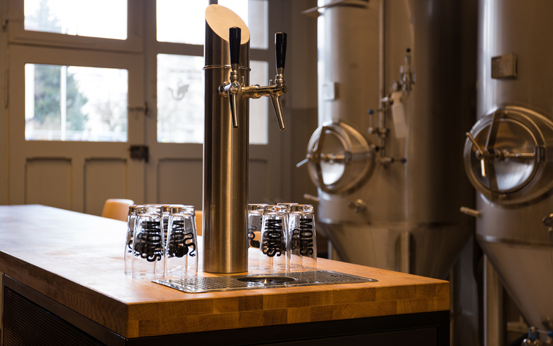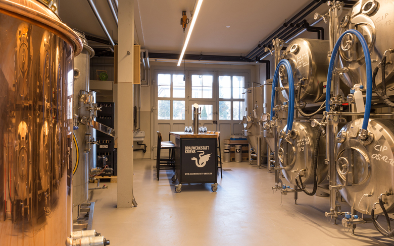 In der alten Teigwarenfabrik auf dem Teiggi Areal in Kriens hat die Brauwerkstatt Kriens ihre Tore mit dem MONS-Bier geöffnet. Der Entwurf legt Wert auf den Erhalt möglichst vieler historischer Elemente, wie die alten Tore und auch die farbige Zweiteilung der meisten Wände des Bestands. Das Zentrum der Brauerei bildet ein fahrbarer Eichenholz-Bartisch mit integrierter Zapfsäule. Alle für den Barbetrieb benötigten technischen Elemente sind im Kopfende des Tisches eingebaut. Zu Zeiten des Rampenverkaufs und bei Anlässen dient der Tisch als Degustationsbar - während des Brauvorgangs wird er zum Arbeitstisch. Die alte Steintreppe der Halle wird als Ausstellungsfläche für die Sixpack-Kartons genutzt. Die Wand dahinter ist anthrazit gehalten um die grafisch edlen Kartons sowie die Braukessel hervorzuheben.