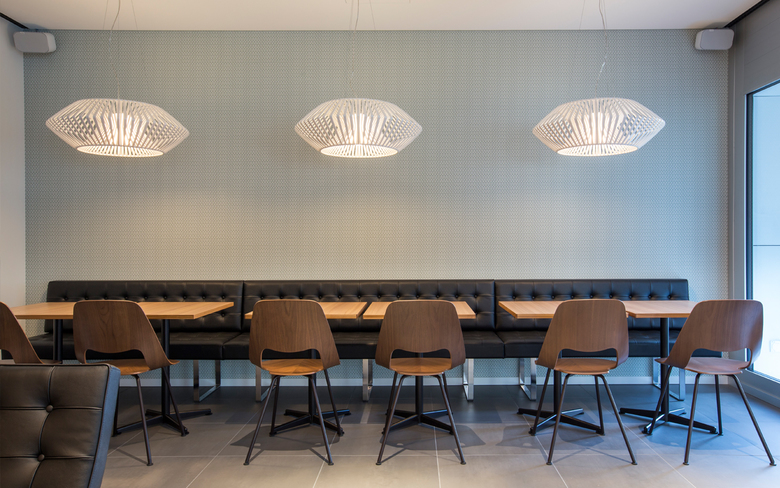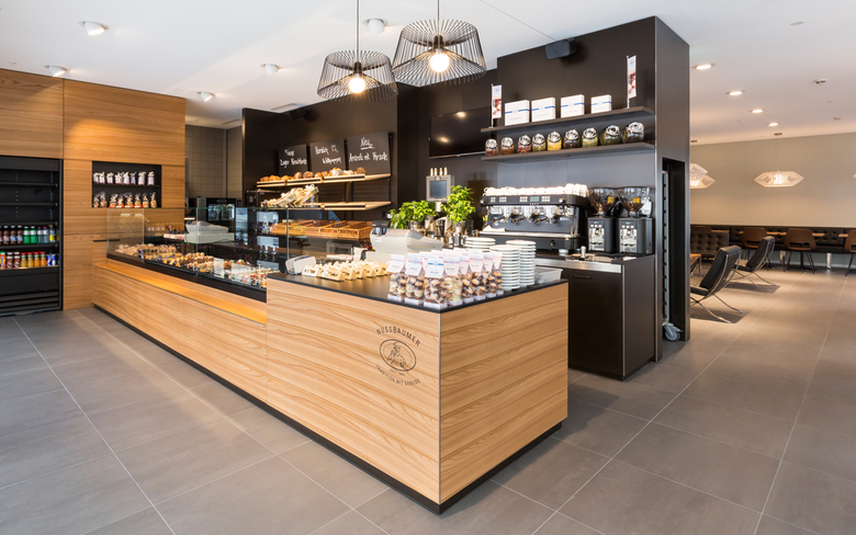 Der 50er Jahre Charme des Gebäudes ist auch in der Ausstattung der neuen Bäckerei spürbar. Der Gebrauch von den einst verwendeten hochwertigen Materialien wurde angestrebt. Dies ermöglicht es den damaligen Zeitgeist der Moderne im Café neu aufleben zu lassen. Das Mobiliar wurde kombiniert aus Klassikern und neuzeitlichen Möbeln. Das Ulmenholz an der Wand und auf den Tischen, der Jill Chair von Vitra, die fein gemusterte hellblaue Tapete und die weisse Sprossenleuchte verleihen dem Café Frische, Behaglichkeit und Authentizität.