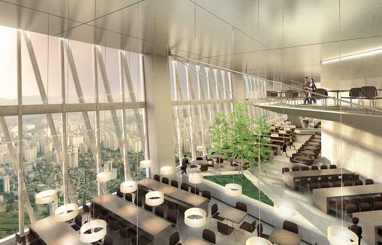 A case study in efficiency, the design of the 1,125-foot-tall Diagonal Tower successfully integrates massing, structure, and performance to minimize wind loads, reduce construction costs, provide dramatic views, and meet strict energy codes—all while maintaining an iconic skyline presence. Located at a prominent corner of the Yongsan International Business District, a new commercial and mixed-use district planned for the center of Seoul, the 64-story building provides more than 1,830,000 square feet of open office space, two double height sky lobbies with a cafeteria and fitness center, and a penthouse executive lounge. The project also includes two retail pavilions and an ethereal glass multifunctional auditorium; these elements define a pedestrian scale and help knit the tower into the neighborhood.