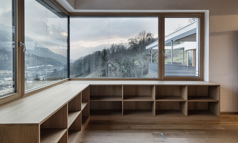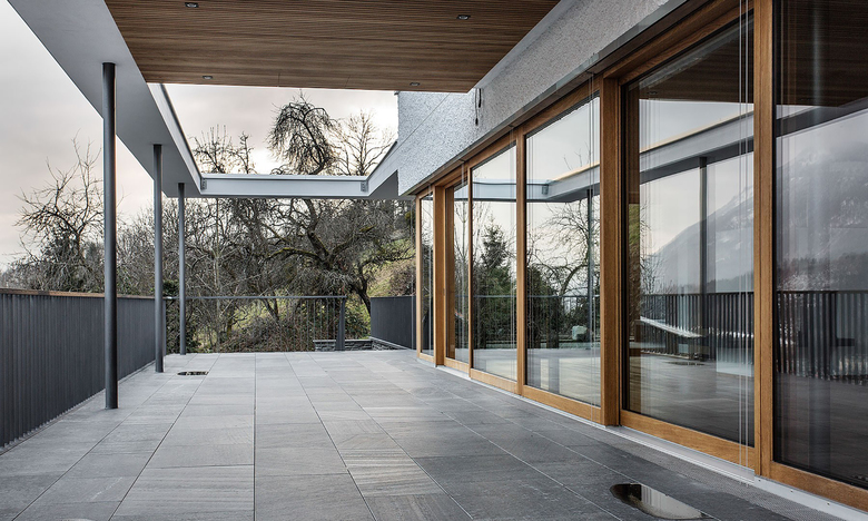 Das Einfamilienwohnhaus ist auf einem nach Süd-Osten orientierten Hanggrundstück in Feldkirch-Levis gelegen. Der Neubau staffelt sich in vier Ebenen dem Hangverlauf folgend. Über eine Zufahrt von der Straße erreicht man den Vorplatz mit Garage, Lager und dem zurück versetzten Hauseingang. Das Erdgeschoss, welches völlig eingegraben im Hang sitzt, umfasst Lager sowie Technikräume. Das 1. Obergeschoss beherbergt die Schlafräume mit Bädern und Ankleiden. Außerdem ist hier ein Gästezimmer, ein Büro, sowie hangseitig die Waschküche platziert. Die Schlafräume orientieren sich talwärts zu einer großen Terrasse. Das Wohngeschoss ist im 2. Obergeschoss untergebracht. Hier erstreckt sich ein großzügiger Wohn/Essbereich mit offenem Kamin, sowie die Küche. Hangseitig gliedert sich ein Innenhof an den Wohnbereich an. Talseitig befindet sich eine große teilweise überdeckte Terrasse mit wunderschönem Ausblick über die Stadt Feldkirch. Über dem Stiegenhaus erhellt ein großes Oberlicht den Gang und das Stiegenhaus. Das Einfamilienhaus wurde in Massivbauweise erstellt. In den Fassaden wechseln Flächen von Naturstein und weißer Putzfassade ab. Die Stützmauern des Untergeschosses wurden in Sichtbeton ausgeführt, welche mit Rankpflanzen bewachsen werden.