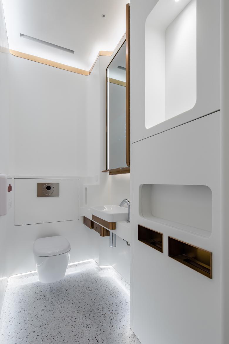 Health and hygiene are the driving force for the project, utilizing seamless flooring and wall materials commonly used in hospitals, the design features streamlined, curved edged and rounded corners to provide easy surfaces for cleaning. A white and copper palette gives a healthy, hygienic appearance with a contemporary, luxurious touch. Proximity sensing doors and fixtures provides hands free access to most facilities, perfect for a city under health threats from COVID-19.