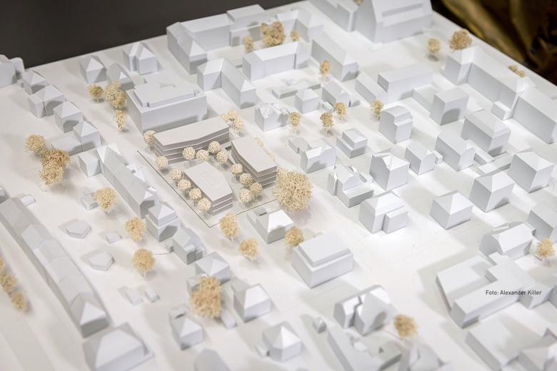 Dem entsprechend reagiert der Entwurf mit zwei Baukörpern zur räumlichen Definition der Haunsperg - und Sylvester-O.-Strasse, die mit einer begrünten Überdachung zusammengefasst eine winkelförmige Bebauung bilden und einem freistehenden solitären Baukörper, der in alle Himmelsrichtungen geöffnet und zentral erschlossen ist.