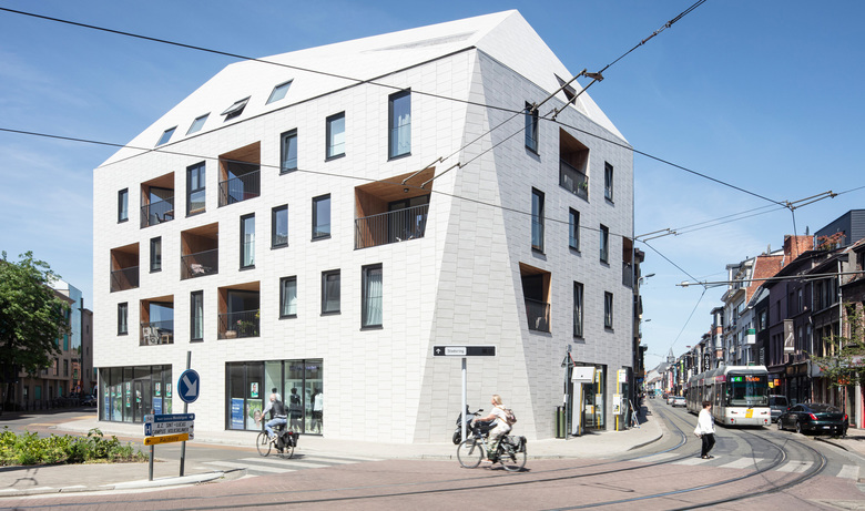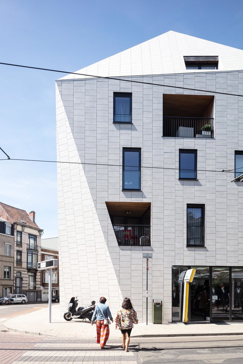 Located on the corner of a merely residential and bustling commercial area in Ghent, OYO designed a mixed use residential building with 23 apartments. OYO conceptualized the building to adapt to its direct surroundings while the roof shape and facade blends together, matching the height of its direct neighbors without losing an interesting density on this corner plot that was abandoned for years. The building imposes a timeless character and architecture while the project enjoys great visibility from the busy crossing in the heart of Ghent’s city center.