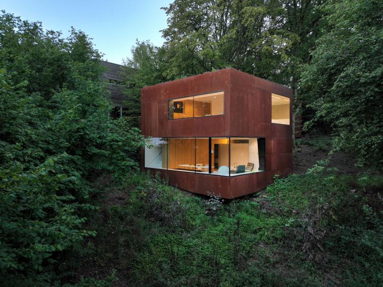 Volumétriquement, ce cube de 7 m de côté est recouvert d’acier Corten en élévations et de végétation en toiture, il dialogue ainsi parfaitement chromatiquement avec la forêt et la pierre de recouvrement de l’habitation existante.