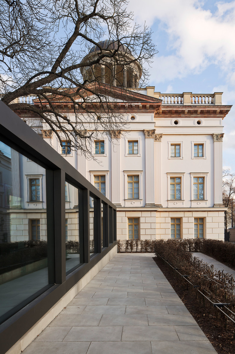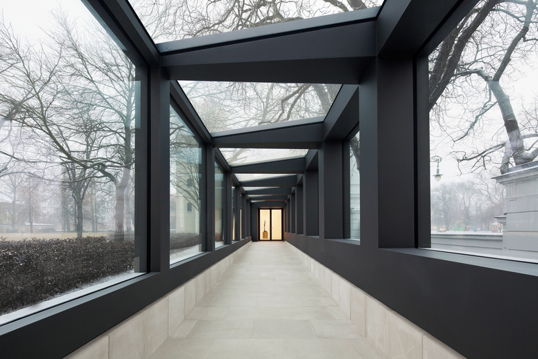Kuehn Malvezzi realized the extension and interior fittings of the Museum Berggruen in the Museum district of Charlottenburg, Berlin. With the addition of a new glass pergola, the Stülerbau-West is connected to the neighbouring Kommandantenhaus at Spandauer Damm, placing the sculpture garden at the centre of the ensemble. By focusing on the thresholds and relationships between the existing buildings, the museum was completely reorientated to incorporate the outdoor, as well as public urban space into the architectural composition. The new 22m long passageway is situated along the historic gate and references elements borrowed from traditional garden design. A colonnade, open to all sides, functions as a belvedere, opening the view to Schloss Charlottenburg and the sculpture garden patio, which is framed by high trees. The transparent steel construction sets itself apart from the historic facades of the two adjoining buildings and emphasizes their respective characters. The walkway links the presentations of the collection in both houses on the raised ground floor, making the garden accessible via a sloped, hedge-lined path.